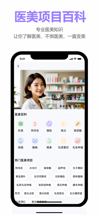 变美啦变美啦变美啦! 肤质问题,拍张照就知道 ----详细功能---- 【拍照测肤】一次专业的肤质检测,一次拍照就可以轻松搞定 【智能分析】从肌龄、出油、痘痘、黑头、毛孔、色斑等多个角度,全面分析肤质 【医美百科】专业医美知识,让你了解医美,不惧医美,一直变美 评估结果不可代替医生的诊疗意见,仅供参考。在使用该应用程序并作出任何医疗决定时,请寻求专业医生意见。