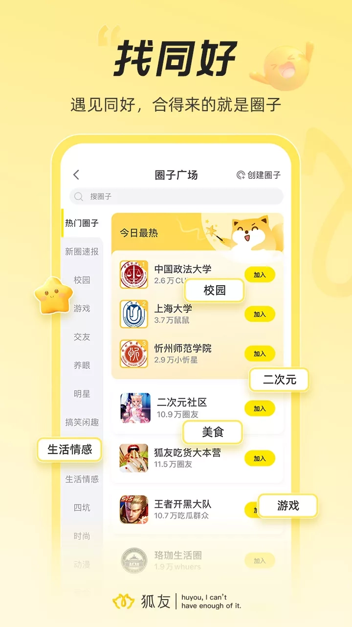 狐友一款搜狐打造的社交APP,这里有值得关注的人,懂你的AI,这里是有温度的社交乐园,多关注,多说两句转发,你的每一个字都会有回音。 【校园】全校级朋友圈 认识有趣新同学,发现学校新鲜事,覆盖学习、求助、吐槽、二手、社团等多个生活场景,加入你的学校圈子,一起记录珍贵的校园时光。 【圈子】汇聚同好狐友 恶趣搞笑、情感分享、兴趣领域、明星八卦...加入感兴趣的圈子,遇见与你一样特别的人。 【关注】这些狐友真有趣 吃货属性、内向星人、二次元爱好者,一键关注狐友为你推荐的好友,用聊天打败孤独。 【互动】开启今日份嗨聊 搞怪网友日常、娱乐明星趣事、吃喝玩乐安利,校园趣事新闻,勇敢说两句转发,今日快乐已被承包。 【分享】心情说给狐友听 “今日份的自拍来了”、“失眠到深夜”、 “这一刻我酸了”,发布动态,分享你的人生点滴,和狐友一起碎碎念。 【动态】发现有趣有才的狐友 探店达人、神级Coser、灵魂画手、健身大神,点击“动态”tab,随时找到你感兴趣的人。 使用过程中如遇任何疑问或建议,欢迎联系我们: 微信公众号:狐友 新浪微博:@狐友 客服邮箱:huyoufeedback@sohu-inc.com