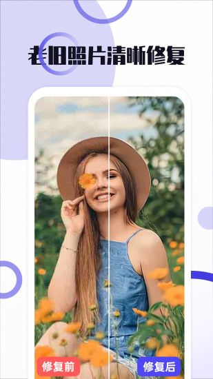 相册照片修复,专业的图片、照片、相片、老照片、老相片的图像处理工具,是一款基于AI图像生成技术的在线图片增强软件。能够实现老照片、模糊照片、斑驳照片、划痕及破损照片、低分辨率照片的画质增强、修复。 功能: 【照片修复】 图像修复:家里相册中保存的老照片,珍贵但却模糊,相册照片恢复运用技术的方式将你记忆中珍贵的照片进行修复,修复五官、,提高清晰度,将破损褶皱部分修复完整 黑白老照片上色:通过大量黑白照片上色的例子,帮你还原符合场景的色彩,让张张黑白老照片翻新上色后焕发出新的色彩和活力。 色彩增强:对五官及背景进行修复,修复照片破损地方,给照片整体进行色彩增强及上色。 【图片处理】 头像动漫化:只要拍照或者从相册中选择你的照片,即可进行人物头像的二次元动漫头像制作,风格、颜色、背景、特效均可进行调整,你的动漫头像一样Q萌可爱。 【时光老相机】:未来的你长什么样?每个人都好奇自己变老后的样子,变老相机,让你提前看看你变老的样貌。 【文件查找】 图片查找、视频查找、音频查找、文档查找、压缩文件查找,让你手机中藏于深处的各类文件,通通为您找出。