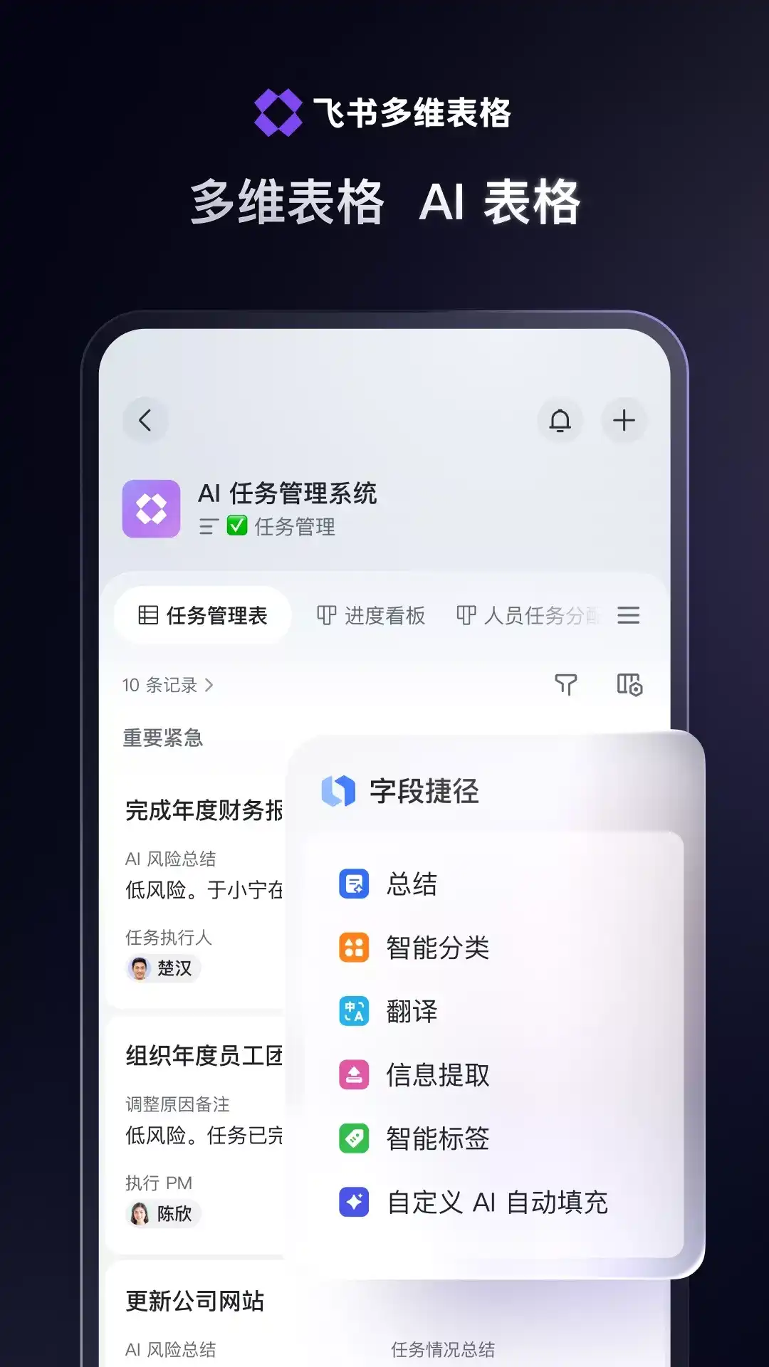 飞书是字节跳动旗下 AI 工作平台,集协同办公、组织管理与业务提效于一体。凭借深度融合的 AI 能力,飞书让 AI 真能用、真落地,助力企业高效协作、智能决策、持续创新。从互联网、高科技、消费零售,到制造、金融、医疗健康等,各行各业先进企业都在选择飞书,与飞书共创行业标杆实践。先进团队,先用飞书。 #飞书 AI 新功能概览:让 AI 真能用、真落地# 飞书将 AI 融入企业知识和业务流程,提供真能用的工具和真落地的服务,与各行业先进企业共同探索 AI 落地实践,做企业长期值得信赖的 AI 伙伴。 - 飞书知识问答:开箱即用的企业专属的 AI 问答工具,基于企业在飞书内沉淀的所有知识、工作记录,不依赖知识库的整理,即可回答业务问题、创作工作文档,并严格遵循用户权限,答案千人千面,让知识转化为 AI 生产力。[应用成熟度:M3] - 飞书智能会议纪要:AI 时代的智能会议解决方案,提供会中实时总结,会后全面回顾,精准的会议纪要、待办提炼,让会议结论更好的落地、会议内容充分沉淀、可进一步被 AI 消费,让每场会议都成为组织数字资产。[应用成熟度:M4] - 飞书 aily:aily 工作助手是飞书提供的面向企业工作场景的智能体(AI Agent),不仅能检索企业内外的知识回答来你的各种问题,也擅长思考和规划,调用各种工具完成复杂任务,为企业员工提供全方位的智能化工作支持。[应用成熟度:M3] - 飞书多维表格 AI:多维表格全面升级,融合豆包、DeepSeek R1 等领先大模型,具备开箱即用的 AI 能力,让 AI 融合业务,带来百倍好的全新体验;飞书多维表格 AI,让你业务一张表,AI 满血跑![AI 字段捷径应用成熟度:M3] 此外,飞书还提供即时通讯、音视频会议、云文档、知识库、日历、审批、邮箱等一站式协同办公能力,让信息流动更顺畅,让每一个人工作更高效、更愉悦,并为 AI 沉淀企业数字资产。 【联系我们】 邮箱:contact@feishu.cn 如有问题或建议,欢迎通过邮件与我们联系。 先进团队 先用飞书