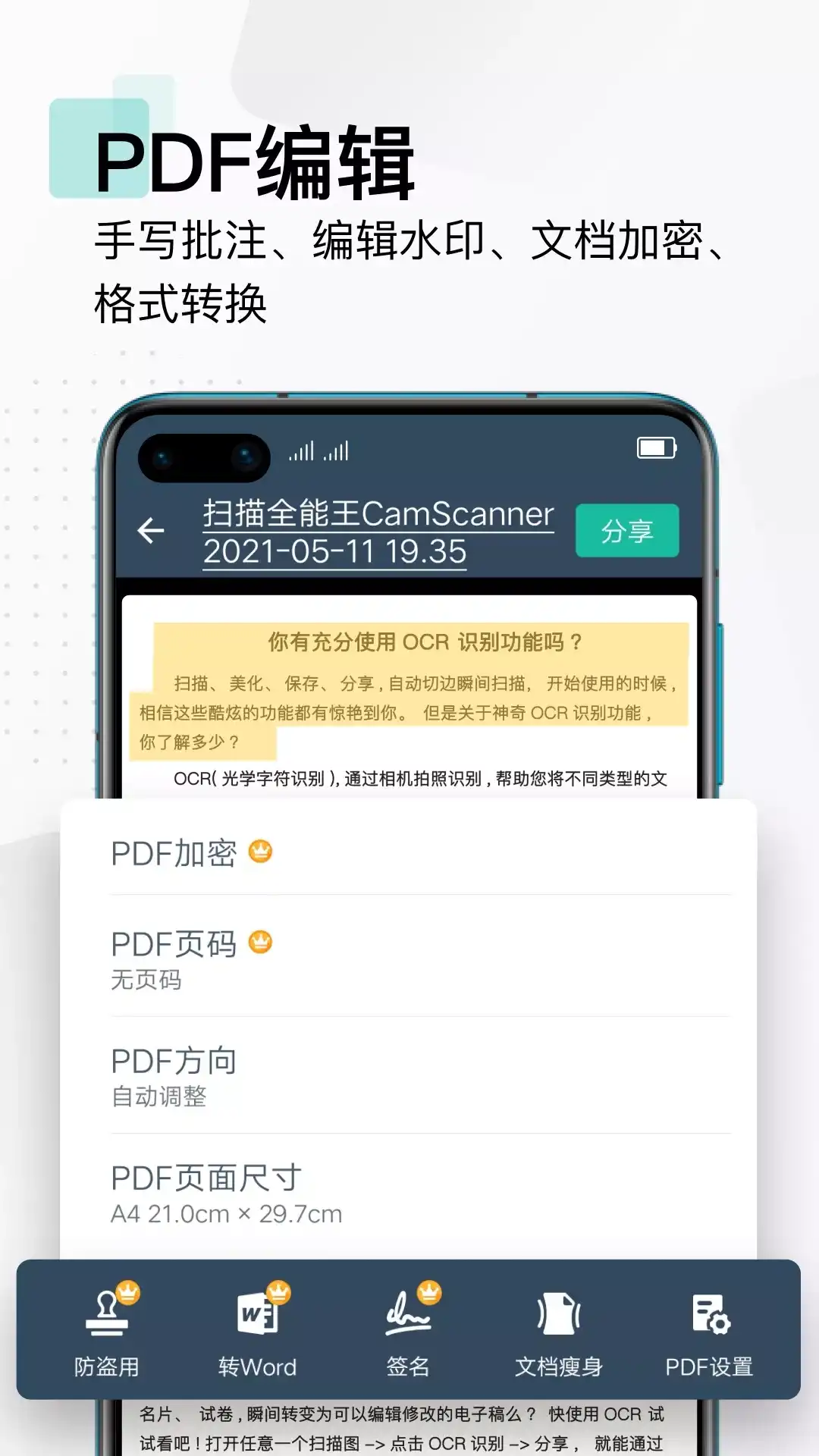 扫描王全能宝是一款能够将书籍、名片、照片中的图片文字识别提取出来OCR文字识别软件,也是一款能够将扫描翻译的全能扫描仪。可以简单方便的将图片文字转换成文本文字,免除了手动输入排版的麻烦;也可以快速的扫描文档,照片等各种文件,将他们直接转成PDF格式保存或打印。 只需拍摄需要扫描的图片或选取相册照片,图片转文字扫描君便能快速将图片中的文字扫描提取出来,可以直接进行编辑、翻译或分享,是一款不容错过的扫描工具。 【文本识别】 * 扫描各种文件、图片、书籍等提取想要的文字; * 强大的OCR文字识别技术支持多语言识别:中文、英语、日语、法语、德语、俄语、葡萄牙语、西班牙语、意大利语; * 智能剪裁文档边界,移除杂乱背景,识别结果自动分段,尽可能还原原文排版; * 智能识别,自动选取识别内容转PDF或是提取文字; * 扫描翻译,支持多种语言的全文互译,无需打开翻译APP,直接调用扫描识别; 【身份证、银行卡识别】 * 内置摄像功能,通过OCR文字识别技术自动识别、提取图片文字 ,解析信息 ; * 高精度自动抓取文字信息,免除手动录入的烦恼; 【文件编辑】 * 添加标注、批注、注释来标记文本; * 内置文件管理器重命名、复制、移动、或删除文档 ; * 支持文件打印 ; 【文档共享】 随手扫描的任何文档,可通过邮件、蓝牙、微博或微信分享给社交好友! 图片转文字-扫描君能够极大的提高您的输入效率,是一款方便实用的手机扫描仪,快快来下载体验吧!