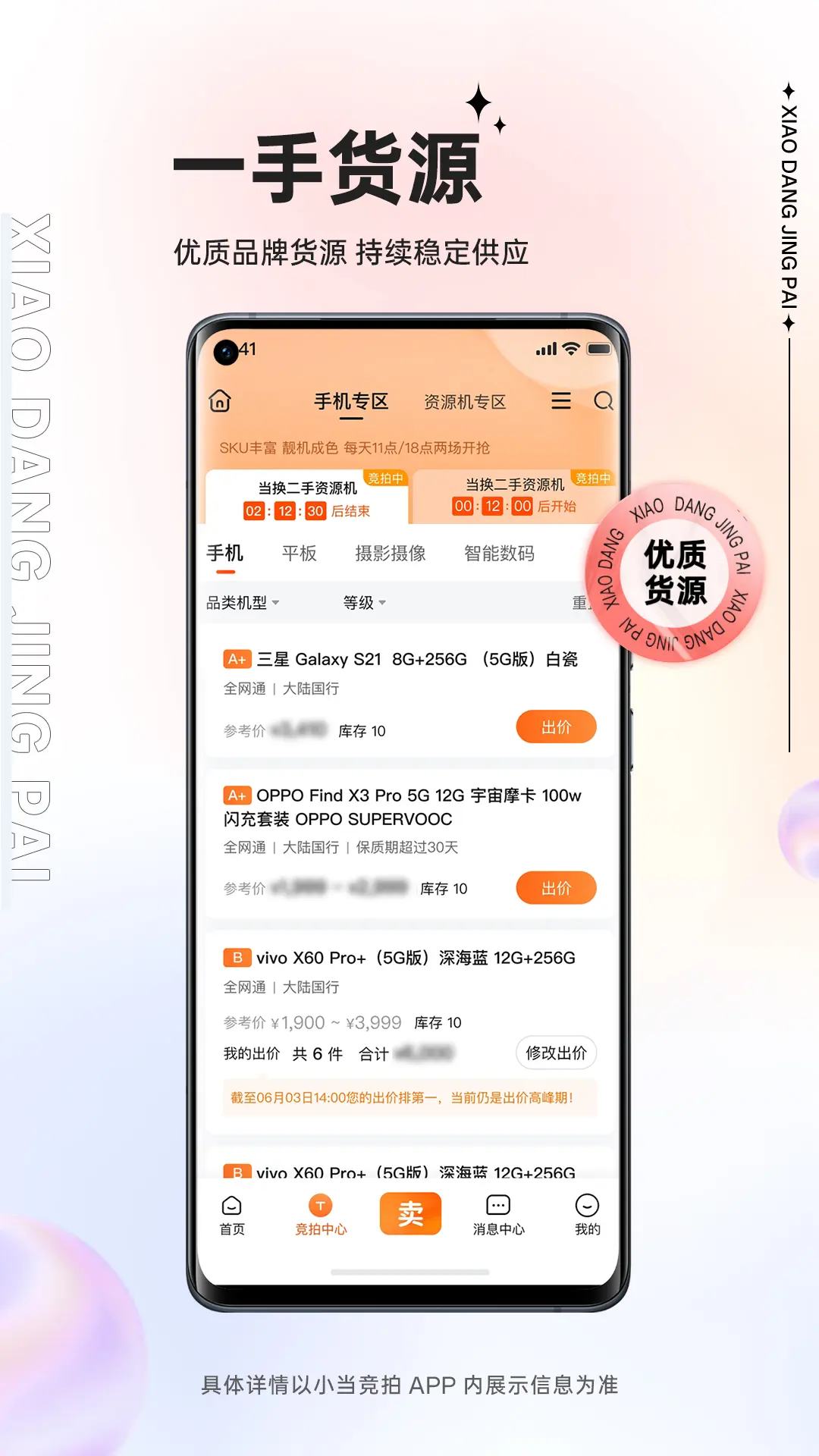 《小当竞拍》APP是专注于二手商家交易的B2B平台,由深圳市小当网络科技有限公司独立自研运营,拥有主流品牌的一手货源,品类齐全丰富。 - - - - - - 功能介绍 - - - - - - 【一手货源】 拥有OPPO、vivo等主流渠道提供的一手资源机、演示机,没有中间商赚差价,质美价廉; 【专业质检】 4道检测工序,38项全新等级,89道科学检测项; 【售后无忧】 线上线下专业团队,1对1售后服务 ,交易高效又无忧; - - - - - -- - - - - - 【联系我们】 关注《小当竞拍》微信公众号:-联系我们-联系客服; 下载《小当竞拍》APP-个人中心-在线客服; 贴心服务,为每一个商家的买卖保驾护航。