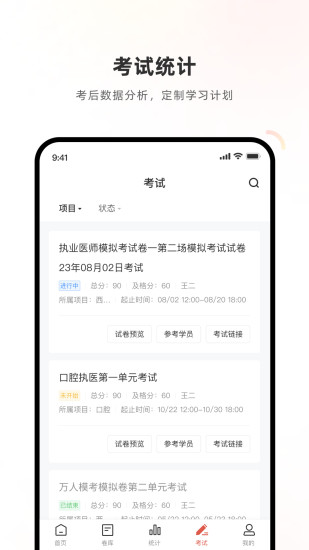 【医院管理】:医院各级管理员通过不同权限的账号密码登录PC端页面,完成学生分组管理,考试通知,组卷,发布考试,试卷存档和统计分析等工作。 1、组织考试:医院可通过手动组卷和策略组卷、平台标准试卷、自定义导入试卷等方式自行组织考试; 2、学员分组:医院可以按照规培生所属科室进行分组,可定向指定某分组用户考试; 3、学情监控:医院可通过后台查看每日、每周、每月参与刷题和看课的【学习进度】,进而给出备考建议; 4、考试存档:医院可存档每场考试数据及考试试卷; 5、数据分析:医院可通过分析刷题、看课、考试等数据预估医院通过率; 6、分发管理:医院可设置多个管理员账号给到各科室秘书,落实针对性管理工作; 7、防作弊:切屏警告及强制交卷等功能设置,保证考试规范。 8、其他功能:迟到30分钟禁止答题,严格设置考试次数、非统一组织灵活设置考试时间等; 【学员考试】:学生登录后,选择所在医院,进入科室分组,参加对应考试,考后可以即时查看成绩,回顾做错试题。 1、在线刷题:题库配有考点还原、文字解析、视频讲解,及各类高效刷题的功能权益,保障高质量、高效率学习保障。 2、参加考试:考前测试提高应试能力、考后