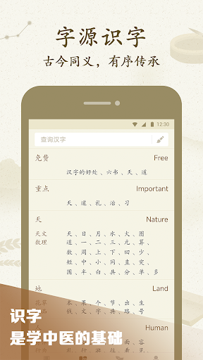 汉字是表意文字。先贤们对自然的观察、对经验的提炼、对宇宙的思考,所有知识都凝结在汉字中,传承给后人。汉字传承千年,每一个字都蕴含了丰富的知识。<br><br>1、每个字都是一堂丰富有趣的大语文课。<br><br>学会“天”字,你就能解答:中国人为什么重视天?四季、节气是怎么来的?为什么北斗指东天下春?<br>学会“习”字,你就能解答:再学一遍知识,是否真能让人开心?真正有效的学习方法,到底是什么?<br>学会“治”字,你就能解答:法治与法制,有什么根本区别?治病和制病,哪个才是真正解决病痛?<br>学会“礼”字,你就能解答:什么是“以礼治国”?婚礼为什么能推动社会进步?中国为什么是礼仪之邦?<br>学会“道”字,你就能解答:什么是“大道至简”?真理是什么?“假理”又是什么?<br><br>学会汉字,这些看似复杂的问题,都有精炼而准确的解答。<br>这些汉字,都是一个个的智慧宝库。<br><br>2、结构清晰的学习,通俗易懂的课程,事半功倍的效果。<br><br>理解字形,打好基础:我们从篆文的原始字形出发,拆解并分析字形,解释字形所表达的原始含义。<br>字义演变,学习知识:讲解字义如何演变出丰富的含义。说明其中的原因,同时教会其中的多学科知识。<br>常用词汇,构建网络:要深度也要广度。学习的都是常用词。知识组织成网络,既好记也不容易忘。<br>注重写字,学练一体:汉字的写法就代表了本身的含义。每一课都有丰富的练习,加强理解,加深记忆。<br><br>最重要的是:古今同义,一举多得。<br><br>汉字的意思,古时到现在并没有大的变化。理解字义的演变与丰富过程,同时也学会了当今常用词的“拼意”逻辑,这就是完成了文言文的训练。阅读文言文水到渠成。掌握文言文技能,真正的理解古籍经典中,丰富深刻的内涵。为继续传承中医、传承中华文化打下坚实的基础!<br><br>3、以“严谨负责、保持简单”的治学态度,编写每一个汉字的课程。<br><br>自秦代以来,中华文字归于一统。后世文字,皆是以“小篆”作为文字演化的根本。篆书,隶书,楷书,各种字体,都是一脉相承。<br><br>我们的研究,以小篆为根本。具体资料,以《说文解字》大徐本、《说文解字》段玉裁注,为基础。再综合各种篆文资料,解释篆文字形。坚持以唯物主义史观,实事求是的解读各中演变。课程内容,避免晦涩,避免玄学,尽量以通熟易懂的文字,把每个汉字变得容易理解,易于学习。<br><br>任何事物都是从简单,逐步发展变复杂的。从汉字的本源学习,才是最有效的学习方法。<br><br>4、字源课程,适合哪些人?<br><br>小学生:理解汉字,高效识字,深刻记忆<br>书法爱好者:理解字形源流,书法更有神韵 <br>国学爱好者:读懂古籍,解锁其中深义<br>中医学习者:学会传统哲学,打好文言文基础 <br>所有想真正“懂中文”的人:中文不是表音文字。学习中文,更要知其所以然<br><br>5、其他功能介绍<br><br>重视写字:专业精细的汉字书写功能,先把汉字拆分记忆,再逐渐提高难度测试。学字又快又牢。<br>丰富教材:支持国内外中文教材,小学教材。提供幼儿到成年人,各类识字材料。还支持自制汉字卡片。<br>汉字源流:快速检索汉字的字源课程,学习想学的字。还提供了基础字典。<br>必背课文:整理义务教育必背文章,白话译文,支持快速抄写背诵。