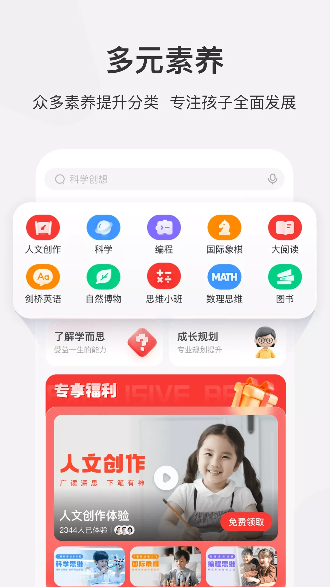 学而思手机端官方学习软件。覆盖编程、创新思维、人文美育、科学实验和围棋等多种素养课程,是一款有趣专业、适合3-16岁儿童和青少年的素养学习软件。帮助孩子激发兴趣、开拓思维、培养能力。 学而思成立于2003年,是好未来旗下综合性教育品牌。我们率先提出小班教学模式,给予孩子全方位的关注。成立以来,我们始终进行着对素质教育的探索和实践。 2021年9月,学而思推出全新的素养课程,专注于3-16 岁儿童和青少年的创新素养教育。依托学而思多年的教研沉淀,结合《学习罗盘》的《21 世纪核心素养5C 模型》等总体框架,秉承“激发兴趣、开拓思维、培养能力”的教育理念,学而思素养自主研发了编程、创新思维、人文美育、科学实验和围棋等多款素养产品。通过构建小组式、体验式、项目式、主题式的创新课堂,激发孩子成长的内在潜能,助力养成有创新意识、创新思维、创新能力和会创新实践的孩子,帮助孩子收获面向未来的能力。 学而思,就在这里等你来! 客服电话:10108899 咨询时间:8:00-21:00