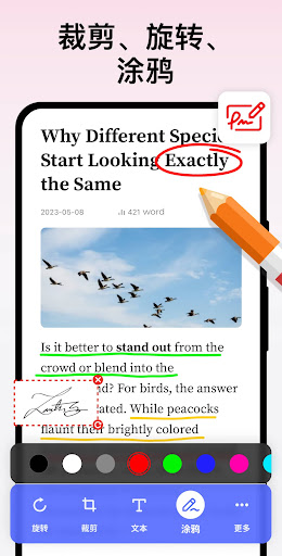 遇到无法编辑的 PDF 文件了?不要再观望了,你已经找到最好用的 PDF 编辑器了,你可以用它 <b>将任何 PDF,PPT,AI,DOC 转换为可编辑的文件</b><br><br>是的,你可以自己编辑 PDF!<br>无需支付昂贵的软件费用,就可以编辑 PDF 文件的每个元素,并进行阅读,注释,签名等操作。此外,PDF 编辑器包含强大的工具和内容,可以让你更快地创建 PDF 文件。<br><br>它是怎么运作的:<br><br>⒈ PDF 阅读器 & 查看器:完全免费,无需联网,且不需要账户!你可以注释 PDF,填写数字表格,添加高亮显示和签名,绘制和编排页面,保存和导出,拆分和合并。<br><br>⒉ PDF 编辑器:编辑一切内容!创建一个账户后,你就可以通过使用无限制计划的 14 天试用版,或免费编辑第一个文件(最多 10 页),来试用其全部功能。<br><br>第一次试用后你可以怎么做?你可以购买更多积分或订阅无限制计划。<br><b>在几秒钟内查看和阅读 PDF 和其他文档</b><br>• 快速打开和阅读 PDF 并滚动页面<br>• 轻松流畅地缩放<br>• 搜索:更快地找到你想要的内容<br>• 为 PDF 页面添加书签以备查<br>• 检查和修改文档信息<br><br><b>PDF 注释器</b><br><br>• 添加具有不同颜色和图标的注释<br>• 以不同颜色突出显示文本<br>• 直接在 PDF 文件上绘图<br><br><b>签名 & 填写 PDF 表格</b><br> <br>• 在文件上进行手写签名<br>• 填写,保存和发送 PDF 表格<br><br><b>PDF 转换器</b><br><br>• 将 PDF 转换为高分辨率打印文件或小型 web PDF 文件<br>• 将 PDF 转换为 JPG 和 PNG<br>• 将 PDF 转换为 Word<br>• 将 JPG 转换为 PDF<br>• 将 Word 转换为 PDF<br>• 将 Powerpoint 转换为 PDF<br>• 将 AI 转换为 PDF<br><br><b>完全可编辑的 100% 免费模板</b><br>制作专业的 PDF 无需从头开始!<br><br>• 文档<br>• 发票<br>• 演示文稿<br>• 信件<br>• 简历 & 证书<br>• 营销材料:传单,海报,杂志,名片……<br>• 以及更多!<br><br><b>强大的编辑 & 设计工具</b> |付费订阅<br><br>无需在应用程序之间切换即可使文档达到完美。<br><br>使用个性化预填充内容,用数千个模板自动创建新的 PDF 和设计。<br><br>易于使用的编辑器:<br><br>• 管理页面:重新排序,添加或删除。只选择和导出你需要的页面<br>• 添加,删除和更改任何内容<br>• 更改文本:编辑内容并使用数百种免费字体<br>• 替换,删除和添加图片,图标或徽标<br>• 更改颜色和图层顺序<br>• 对元素进行旋转,翻转和裁剪<br>• 快速对齐文本<br>• 一键在长段落中添加列<br><br>一键大小调整器:点击"调整大小"并选择新的格式,你就可以轻松调整大小来适应任何场合,并保证最佳质量。<br><br>人工智能驱动的背景清除器:我们强大的人工智能可以检测出图片的背景,你可以一键将其清除。<br><br>免版税资源:无需为单个图形或图片包付费。不必离开应用程序,即可使用高质量的图片和图表为你的 PDF 文件增色:<br><br>• 数以十亿计的来自 Unsplash,Pixabay 和 Photodexia 的图片<br>• 数以千计的图形。插图,图标,贴纸和字体<br>• 通过我们的 Pro+ 计划额外访问 1.25 亿张 Shutterstock 图片<br><br><b>协作 & 文件管理器</b><br><br>• 更多协作,更少摩擦<br>免费与 5 名团队成员共享你的 Pro+ 福利,共同完成工作!<br><br>• 在任何地方编辑:<br>在所有设备(手机,平板或电脑)上自动同步所有 PDF 文件<br><br>• 资产库:<br>更智能的文件管理和品牌一致性。存储你的所有元素(徽标,字体,调色板,文本等)。通过编辑器轻松访问所有内容。<br> <br>• 连接到 Google Drive 云端硬盘:<br>连接你的 Google Drive 账户,从而轻松访问和保存 PDF 文件。<br><br>• 文件夹:<br>在文件夹中组织 PDF 文件,并以前所未有的速度浏览内容。