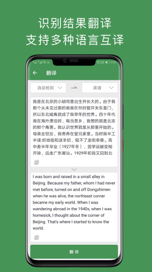 文字扫描OCR是一款能够自动扫描文字的扫描大师软件。高清扫描,文字识别,PDF编辑,一键搞定。 精准文字识别,快速精确翻译支持27个国家语言,使用 OCR字符识别功能将您的扫描件转换为可编辑文本。自由框选图片上文字内容进行识别翻译又是一款精准的扫描识别翻译软件! 【文字识别】精准OCR图像识别技术,将图片中的文字转换为可编辑内容,您可以随意修改、复制、导出,以及将该内容翻译成多国语言,代替打印机中的扫描仪,一键自动识别。 【拍照翻译】自动抓取图像拍摄到的图像文字进行翻译,支持十多个国家语言。 【证件扫描】身份证、毕业照、房产证等,统统都可以扫描成电子文档,不要再找笨重的扫描仪器去扫描证件了。 【批量扫描】不管是扫描一本书还是扫描工作文件,批量扫描功能帮您一键轻松完成。 文字扫描OCR软件,文字扫描、扫描仪、扫描翻译、文字识别、自动识别文字各种优点集于一体。丢掉笨重的仪器,手机app帮您轻松完成,再也不需要急忙去找打印店啦!