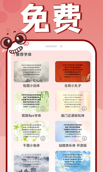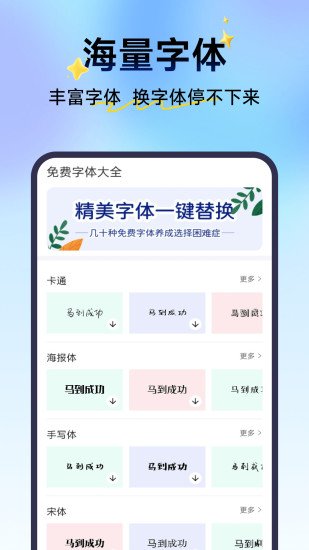 8000+手机字体库 × 专享定制签名设计 × 专属小说阅读器,从字体美化到社交个性,再到沉浸阅读,全方位打造你的独特手机体验! 我们提供海量、酷炫的手机字体库,你可以根据个人喜好随意选择和搭配,轻松打造个性十足的手机界面,创作属于自己的主题、壁纸、头像,用酷炫字体书写你的社交名片! 为什么千万用户选择我们? 【海量字体库 & 贴心分类】 内含8000+款字体,持续更新!涵盖楷体、黑体、行楷、圆体、篆体等经典字体,以及爆款的明星同款、可爱少女、霸气男生、创意艺术字体。 贴心分类设计,支持按风格、用途、类型筛选,助你3秒找到心仪字体! 【一键更换 & 广泛兼容】 完美支持微信、QQ、微博、剪映、头条等主流APP及各类输入法,聊天阅读更有趣。 【个性定制 & 创意玩法】 不止换字体!更可定制专属主题、壁纸、头像,用酷炫字体书写你的社交名片,成为朋友圈炫酷的你! 【定制签名 & 小说阅读】 重磅新功能! 我们联合专业签名艺术家,为您提供专属艺术签名设计服务,让你在职场和社交中脱颖而出! 内置专属阅读器,可直接导入本地小说,任意应用您下载的字体和设置背景,享受沉浸式阅读乐趣。