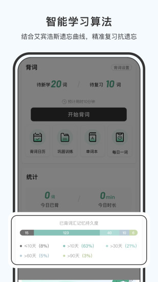 墨墨背单词,高效抗遗忘,完美规划海量词汇记忆。 • 全应用商店累计超过 3 亿下载总量 • 深受考研用户欢迎的背单词App • 教育类好评率超高的产品之一 • 获得应用市场奖项如:VIVO「极光奖」、华为「匠心奖」、OPPO「至美奖」、 小米「金米奖」、豌豆荚「设计奖」,并多次获得各应用市场官方专题推荐。 • 墨墨发布了具有可解释性的记忆模型,并发布于全球数据科学领域权威会议 ACM SIGKDD 《A Stochastic Shortest Path Alogorithm for Optimizing Spaced Repetition Scheduling》 • 墨墨首次将记忆预测与调度优化相结合,提供完整的间隔重复规划系统框架,并发布于国际数据挖掘知名期刊 IEEE TKDE 《Optimizing Spaced Repetition Schedule by Capturing the Dynamics of Memory》 「这里有:科学高效的抗遗忘算法、精彩美妙的单词内容、简洁的操作,实实在在帮你高效规划海量词汇记忆。」 【精准高效的抗遗忘策略】 墨墨背单词基于 1200 多亿条用户记忆行为数据,结合你的每次记忆反馈,识别你的记忆持久度,分析你的遗忘曲线,精准定位你对每个单词的遗忘临界点,动态调整复习规划,帮你高效规划海量词汇记忆。 【完美配合知名词汇书籍】 墨墨背单词尊重权威的实体词汇书籍,全面兼容实体书籍的同步学习,词库实时更新,不管是小初高、四六八,还是考研、出国考试,墨墨背单词通通兼容,你再也不用担心所学词汇范围的权威性。 【简洁且极佳的单词内容】 墨墨背单词,为每一个单词都精心准备了简明的释义、丰富的例句和精妙绝伦的助记,单词内容的精细度远超同类产品。 【一目了然学习情况统计】 墨墨背单词以图表的方式记录了你复习的情况,并配合奖励策略督促你更好地坚持复习,包括三大图表统计系统: * 遗忘曲线:真实反映了你在每个阶段对已学单词的遗忘率; * 学习情况:你每天复习了多少单词,已学情况及未来的复习压力; * 记忆持久度:你可以清楚地看到已学单词的熟知度情况。 【创建属于自己的云词本】 墨墨背单词允许你随时添加新单词到学习列表,你可以创建属于自己的云词本,或提取一篇文章中所有的单词,很好地配合了你平时生活学习对规划单词记忆的需求。