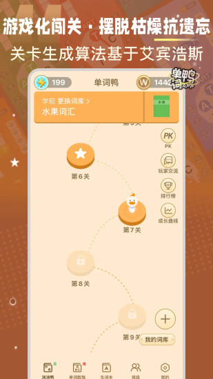 《单词鸭APP》是一款休闲的游戏化闯关学英语的应用软件,包含2款英语学习游戏: 单词消消乐&单词数独。像玩消消乐一样的消单词,像玩数独似的拼单词!摆脱传统枯燥背单词,在玩中不知不觉学会单词,玩多久都没有浪费时间的罪恶感。 游戏关卡的生成算法基于艾宾浩斯遗忘曲线,千人千面抗遗忘 【游戏化闯关·玩着学英语】 ●单词消消乐 · 像玩消消乐一样的消单词 ●单词数独 · 像玩数独似的拼单词,难度系数高 ●闯关过程中答错的单词,自动进入生词本 【海量词库&教材同步配套】 ●小学/初中/高中/四级/六级/考研/托福/雅思/托业/GMAT/GRE/SAT/职业英语...全阶段 ●小学/初中词库,多版本教材与课本同步,贴合学生校内课本单词 ●如果没有符合自己的词库,可自建词库 【单词卡】 ●左滑不认识,右滑认识,不认识的自动进入生词本 ●用单词卡学习任何语言,无论英语,日语,西班牙语等 【自建单词卡】 ●多种创建方式,可通过AI录入、EXCEL导入、单个录入、批量录入的方式创建自己的专属词库 ●单词卡不限语言和科目,如英语,西班牙语,日语,德语,语言学习、医学、法律、数学、社会科学... ●可以搜索并学习其他同学创建的单词卡 【生词本】 ●五大类别: 累积,认识,不认识,收藏,掌握 ●玩的过程中,遇到的单词,都会进入到生词本累积 ●答错的进入不认识,答对的进入认识 ●听说读写测试全达标的单词,进入掌握 【测评】 ●全方位测评听说读写的能力,只有听说读写都达标,才会进入到掌握 【单词PK】 ●单词游戏在线PK,一起学习有动力 【班级】 ●邀请朋友和同班同学一起学习单词 ●与朋友和同班同学之间分享自建的单词卡 【成长曲线,让成就看的见】 ●每天打卡学习,可以查看累计单词数,认识单词数,掌握单词数,累计通关数,今日通关数,成长变化看的见 ●用成长曲线记录玩单词历程,点滴积累清晰呈现,见证实力飞升 【休闲化&碎片时间】 ●每天10-15分钟即可循序渐进,通勤、排队、等待时间不浪费 ●动动手指就能消单词,像玩消消乐一样,指尖轻点,即享畅快 【词根记忆】 ●背单词太难?试试词根记忆,抓住单词规律,轻松记住一大串 ●别死记硬背单词啦!用词根记忆,记一个顶一群,词汇量飞涨 ●学单词有捷径!词根记忆法,让你一眼看透单词,背得又多又快