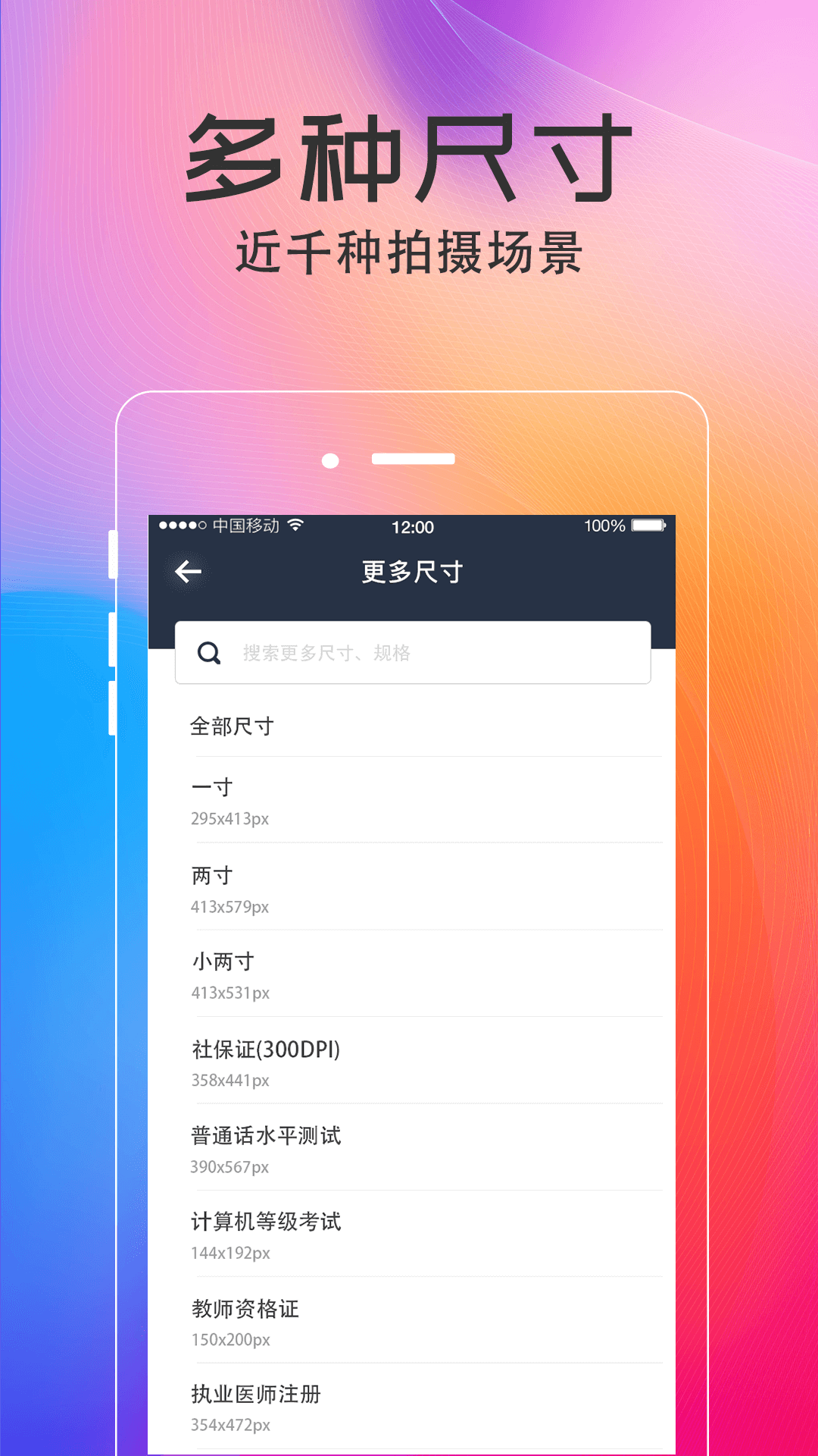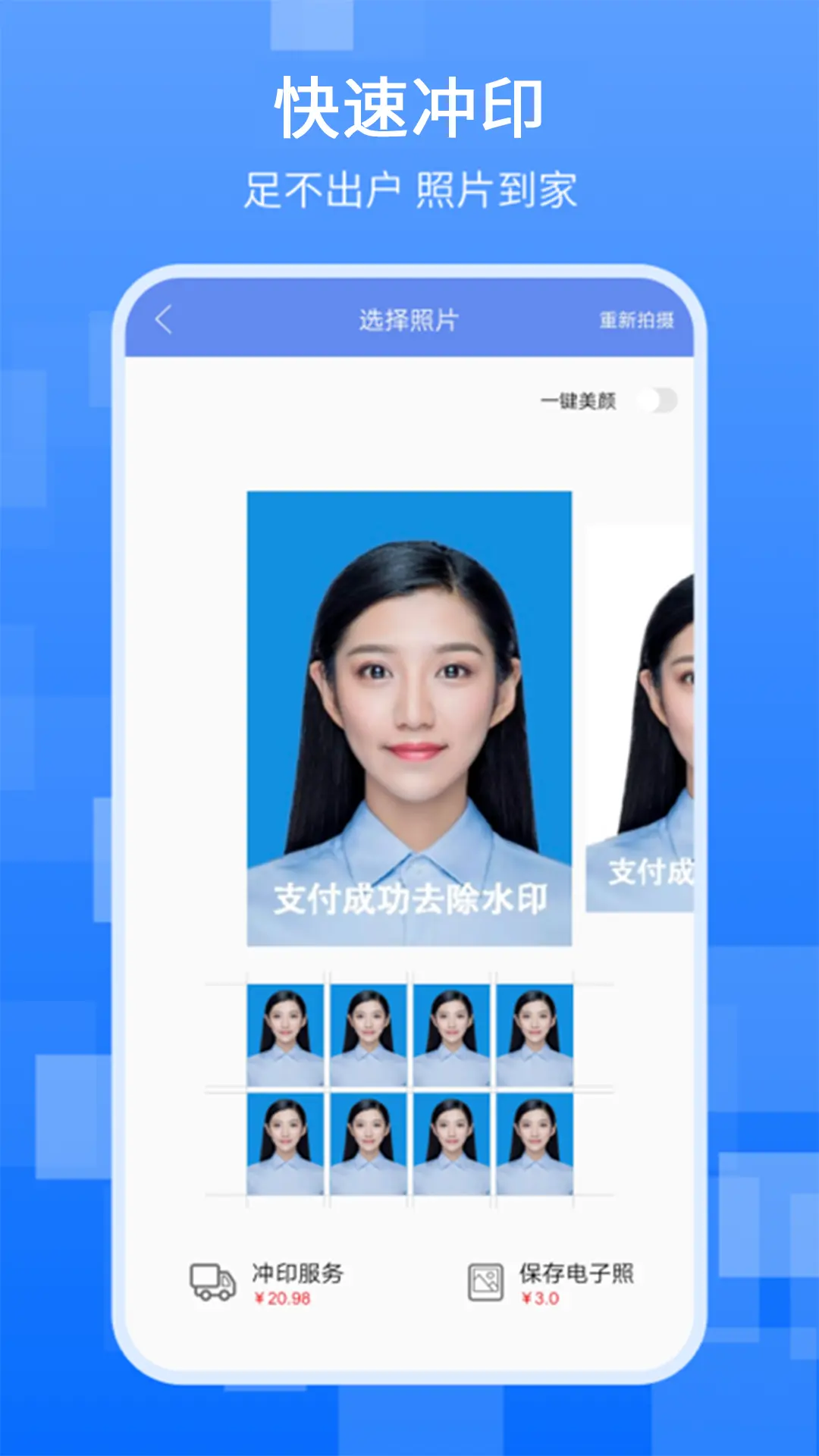 专业智能证件照拍摄制作 一款可以自己制作证件照的照片处理工具,拥有百种证件照尺寸规格,可以一键美颜告别素颜拍照尴尬,智能替换高级色背景,各种男装、女装、童装、正装随意搭配。 一款功能强大的专业证件照制作软件,集无水印保存、换底色、换服装、人工修图、在线冲印等功能于一体,满足用户全场景使用需求。 满足对证件照的一切需求,更快捷高效的用手机制作证件照。 有着规格人性化、拍摄多样化、美颜自然化、操作智能化等一系类特色功能,而且无需再次查询尺寸,直接在线裁剪即可完成。 一寸、二寸等常用寸照,采集证件照,结婚证照片、身份证照片、学籍证件照片、考试证件照片、简历照片、名片照片等数百种证件照尺寸格式都能得到满足!支持自定义规格,文件大小,分辨率,任意规格轻松获取。 系统一键更换多种底色,操作简单省事。同时,除了红底、白底、蓝底等常规色以外,更有高级色、马卡龙、渐变等个性化底色可供选择,满足多元风格需求。 提供职业西装、衬衫等正装,男装、女装、童装素材齐全。满足多种场景需求的同时,支持自助调节服饰大小和位置,搭配消除笔调整细节。