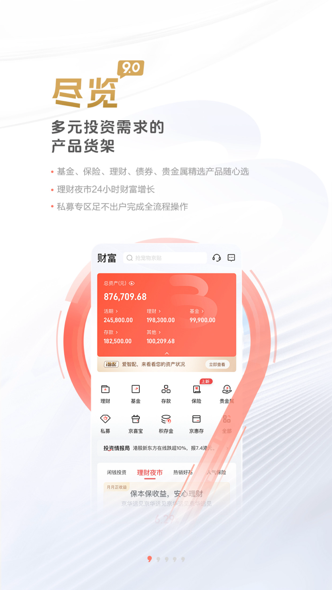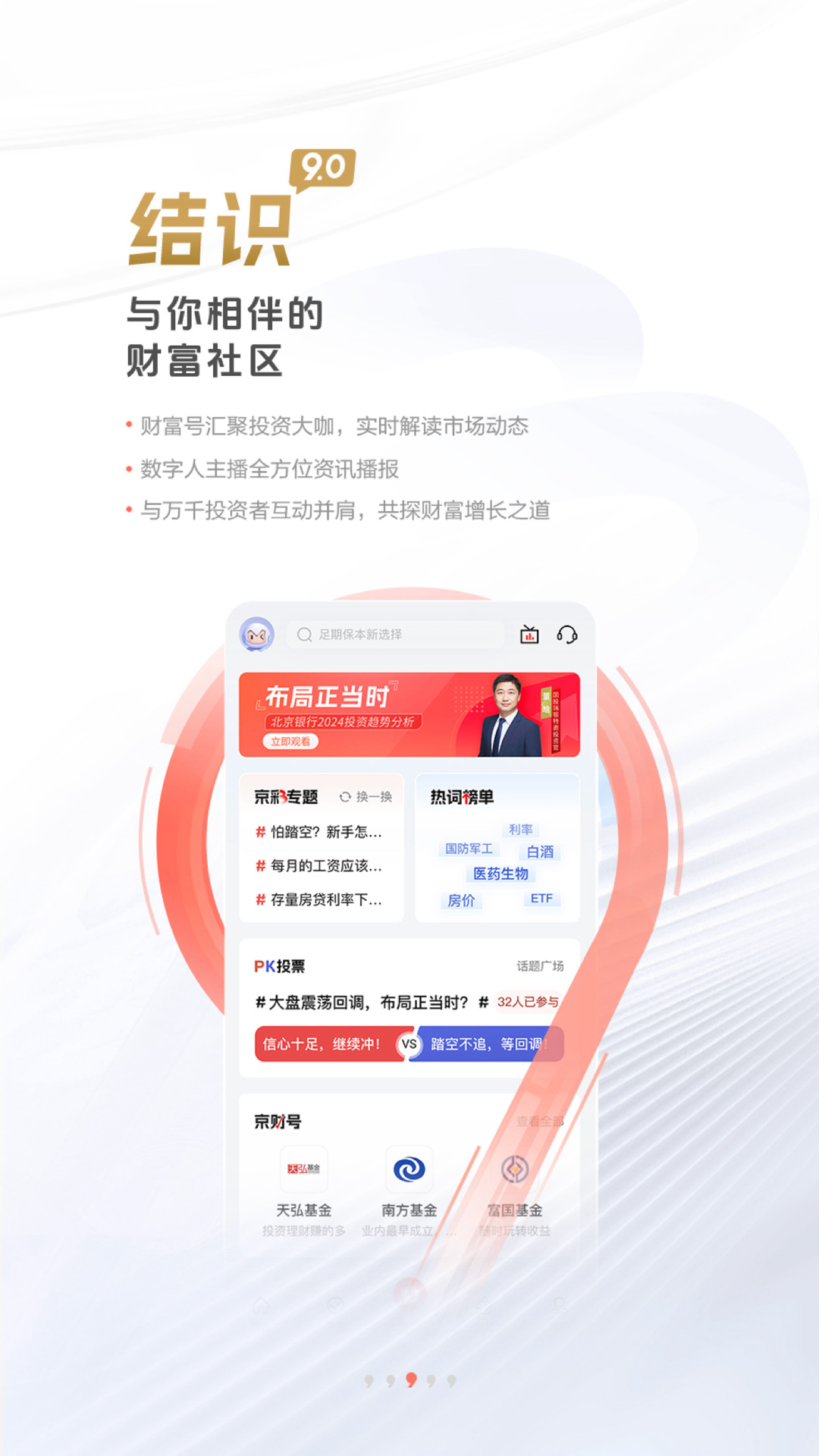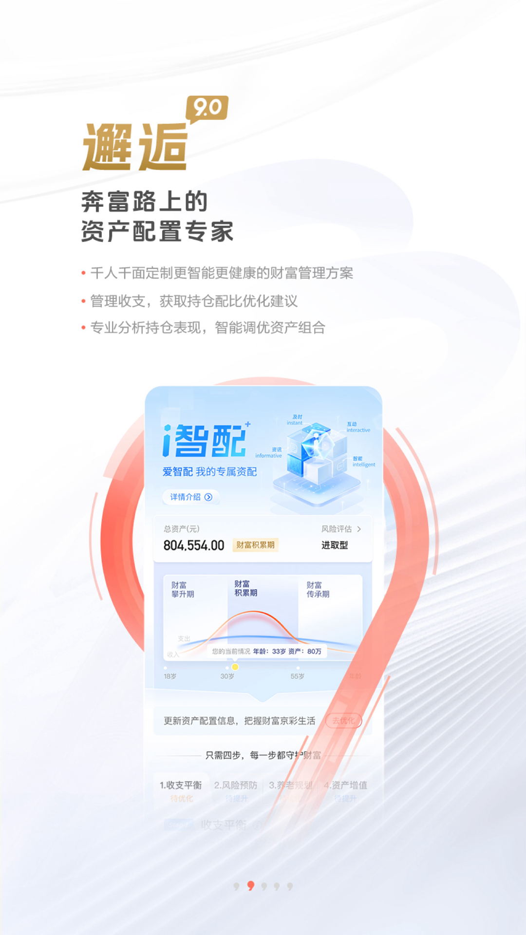 “智”在掌握,成9财富。北京银行“京彩生活”手机银行APP9.0全新升级: 一、体验更丝滑: 1. 收支明细,让每笔财富有迹可循,财富增长更具体。 2. 京e贷,全面升级,覆盖更多客群,更低利率,更高额度。 3. 京行云网点,全面掌握网点动态,一站式享受便捷业务办理。 4. 智能搜索,智能匹配算法,优化搜索体验,丰富呈现搜索结果。 二、投资更专业: 1. 产品货架,满足多元投资需求,基金、保险、理财、债券、贵金属精选产品随心选。 2. i智配,千人千面定制更智能更健康的财富管理方案,智能调优资产组合。 3. 财富社区,汇聚投资大咖,实时解读市场动态,共探财富增长之道。 4. 京彩直播间,数字人直播全方位资讯播报。 三、场景更全面: 1. 养老专区,专业工具智能评估,快速生成个性化备老养老方案,养老知识、医疗健康、生活出行,尽享一站式养老服务。 2. 私行专区,定制化私银理财、私募产品、信托服务等优质产品,一手掌握,产品权益综合呈现 四、权益更尊贵: 1. X+会员,多样玩法解锁任务地图,积分兑换心仪权益。