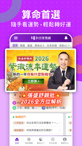 2026紫微流年运势,新上线!<br>下载科技紫微网APP,抢先掌握你的2026机会点,提早规划、顺势而行!<br>无论是紫微流年、星座流年,还是每日/每周/月运,都能全方位解析,让你在人生的关键时刻走得更稳、更顺!<br><br>科技紫微APP|全球最大命理平台,超过1000万会员一致好评!<br><br>由紫微权威张盛舒老师创办,科技紫微网集结星座、紫微斗数、姓名学、八字、塔罗、农民历、日韩命理、AI算命、文章等多元服务,提供最完整的命理体验。<br><br>功能亮点:<br>1.2026年度运势:紫微流年 × 星座流年,双重剖析,提前规划整年运势。<br>2.有卦AI占卜师:烦恼心事,占卜师随时在线解答。<br>3.星座运势:每日、每周、每月、全年全解析。<br>4.紫微运势:会员专属,精准看日/周/月好运关键。<br>5.农民历查询:免问人也能轻松选吉日。<br>6.免费命盘:快速查星座、紫微命盘。<br>7.命理文章:星座/命格/运势分析、开运技巧一应俱全。<br><br>不论你是命理新手还是资深爱好者,科技紫微APP都能给你最贴心的指引,帮助你趋吉避凶、迎向幸福人生!
