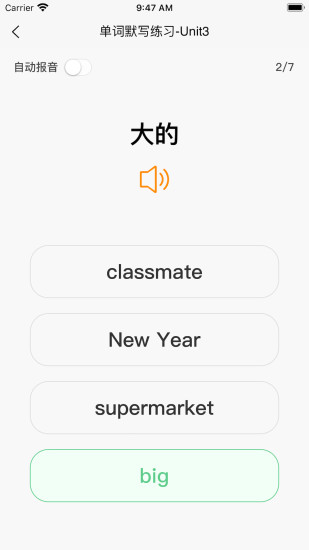 小学英语课文单词同步乐学 酷狗英语:小学英语同步背单词应用! “小学英语单词通”与全国各套小学教材配套单词表完全同步,通过动画视频,图解单词、单词带读,游戏过关,单词听写,交互练习等多维度记忆方式,帮助小朋友轻松快乐高效背单词! 本应用使用先进的语音识别和智能学习技术,基于国外主流的少儿英语学习理论,由经验丰富的重点小学英语老师设计而成。 产品优势: 1.配合新课标小学英语教材,同步提供权威的释义、例句、练习和纯正的英语发音 2.难度分级控制,确保小朋友在练习过程中碰到词都是学过的词 3.图文并茂,趣味拼读,调动眼、耳、口、手多感官记忆 4.使用图片、录音、语音识别、手势语帮助学习记忆 5.单词记忆游戏化,游戏界面精美,趣味十足,记忆效果翻倍 6.寓教于乐,每天10分钟,随时随地,简单高效 7.提供小学英语学习词典 本产品由专业英语学习品牌酷狗英语出品。版权所有,盗版必究!