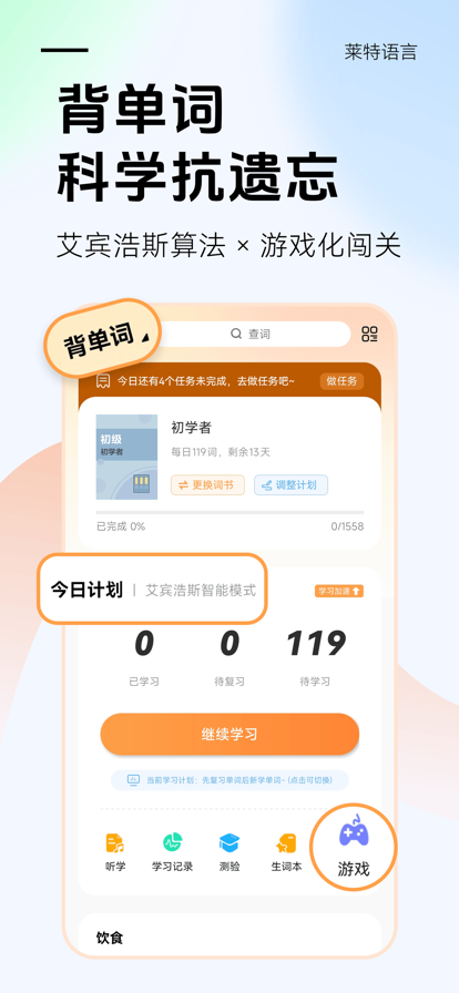 零基础快速入门学英语。 英语学习者的随身工具,不同阶段英语学习者的学习神器,轻松学英语,牢固背单词,地道英语学习助手,包含了较常用的基础英语口语与短语,随身携带的英语老师,打造一口流利英语。 软件特色功能: 【每日一句】 每日一句既有代表性的短话和句子,还有日常生活中的常用短语和句子。每日一句每日打卡,学习是一种习惯。 【随身听学】 利用碎片时间,随时随地学英语,每天5分钟,轻松学英语。 【字母表】 英语真人标准发音,可录音跟读学习,轻松掌握英语字母字形和英语发音。学法基础,学习英语字母发音表,单元音,二重元音,辅音标准发音与发音技巧。每日英语听力,贴心的出国翻译官。 【记忆曲线背单词】 使用艾宾浩斯记忆遗忘曲线科学计划,合理复习,单词牢记更轻松。 【多题型练习】 听音辨意、听音选词、听音写词、单词拼写、听音速记等专为英语学习者设计的复习方式,寓教于乐,让英语学习不再枯燥。 莱特英语学习背单词软件在你的英语学习路上一路相随,贴心定制,一对一服务,随时了解自己的学习进度,解决学习中出现的任何问题,不受时间和空间的限制。学习进度时刻跟进,轻松了解自己的学习情况,省心省力,同时也可以轻松的显示出学习复习进度,便于及时复习强化,学习进度在手,学习计划制定好,英语学习不再发愁。