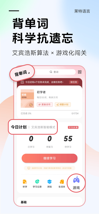 零基础快速入门学日语。 莱特日语背单词软件,满足不同人群的日语学习需求。 零基础入门、口语提升、高考日语、JLPT能力考都适用的专业日语学习软件 如果你刚开始接触五十音图;如果你想提升口语表达、与日本人无障碍沟通;如果你想用日语参加高考,外语成绩轻松提高80分;如果你想快速通关JLPT能力考试。快来下载使用莱特日语背单词软件吧,更多精彩等你发现! 软件特色功能: 【日语五十音图】 零基础开始学日语发音,包含全部的假名手写动画演示以及十多种假名复习方式,让日语初学者轻松入门。 【记忆曲线背单词】 使用艾宾浩日记忆遗忘曲线科学计划,合理复习,单词牢记更轻松。 【多题型练习】 听音辨意、假名选意、听音打词、听音写词、假名组合、听音速记等专为背日语单词设计的复习方式,寓教于乐,让日语学习不再枯燥。 【完备日语词库】 新标准日本语、大家的日语、新编日语、JLPT考试词库以及分类词库,这里都可以找到。