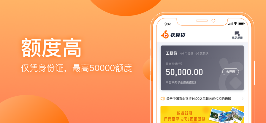 仓廪实而知礼节,衣食足而知荣辱。衣食贷作为一款消费信贷产品,为用户提供方便快捷安心的借款服务,手机操作,资料精简,最快30分钟即可获得借款额度,最高额度5万。想用钱随时借款,可以通过分期慢慢还款。 闪电借款:门槛低,手机号码注册即可成为贷款软件的用户,本贷款无需抵押和证明,填写基本资料即可申请贷款; 智能审核:我们采取系统智能审核的方法,全程无人工参与,公平公正,审核快速,最快30分钟就能出贷款额度。 额度灵活:为了满足不同顾客的资金需求,我们设计了低至1000元高至50000的额度,只要你敢来,我们就敢给,让你口袋满满衣食无忧。 还款方便:在线还款,绑定银行卡,到期自动扣款。也可以选择提前结清,自主还款。