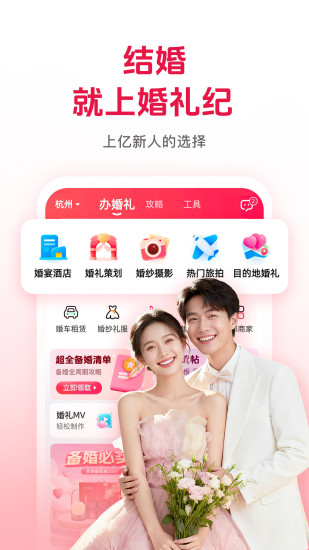 *结婚就上婚礼纪! 上亿准新娘们信赖的结婚好帮手! 婚礼纪,不仅是可以制作婚礼请柬的App,还可以提供拍婚纱照、订婚宴酒店、找婚礼策划、选婚纱礼服、买结婚用品、租结婚婚车、做备婚攻略等一整套结婚所需服务,带您开启轻松的备婚之旅。 结婚就用婚礼纪【省心】:全国20万+优质结婚商家均已入驻婚礼纪,速帮您定位心仪的商家,更有无忧订、买贵必赔等服务保障,助您省心备婚。 结婚就用婚礼纪【省力】:上亿+新娘分享超实用备婚攻略,更有婚礼纪结婚顾问专属服务,帮助您省力备婚。 结婚就用婚礼纪【省钱】:包含婚纱摄影、婚宴酒店、婚礼策划等全网性价比套餐,海量优惠折扣专场,帮您轻松节省结婚开支。 【婚礼纪-您的结婚好帮手】 *找备婚攻略就上婚礼纪:超全备婚清单、婚礼流程等等您想知道的备婚干货都在这。 *选婚纱摄影就上婚礼纪:聚集全城人气婚纱照商家,无隐形消费,潮流风格大片随心拍。 *订婚宴酒店就上婚礼纪:全城品质婚宴酒店入驻!支持在线查档期,热门日子也能轻松订到合适的酒店。 *找婚礼策划就上婚礼纪:1v1定制,小预算也能办大婚礼。更有海量优质结婚案例,满足您的婚礼灵感启发。 *找婚礼化妆师、婚礼司仪主持