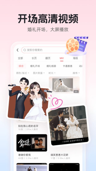 婚礼乎视频APP 是一款不用剪辑的视频电子相册制作工具,帮助结婚新人轻松制作电子相册,同时还有宝宝相册,儿童生日相册,寿宴视频相册,毕业视频相册,节日祝福视频等。 简单三步:选择视频模板——修改文字、替换图片——生成视频,即可制作出媲美大片的酷炫视频,无需复杂视频剪辑,视频制作就是这么简单! 【功能优势】: -「在线制作视频」 在线视频相册模板,只需修改文案内容,替换照片,就可以创作属于自己的精彩视频电子相册。场景包括婚礼、生日、寿宴、同学会、节日祝福等,风格多样,个性十足。 -「模板场景丰富」 上千个视频模板,包含婚礼开场暖场视频相册、宝宝相册、儿童生日相册、寿宴视频相册、毕业视频相册、节日祝福视频等,省去设计环节,一键成片!助小白快速实现创意作品! -「操作简单」 只需要选择自己喜欢的视频模板后上传照片,立刻拥有自己的电子相册视频。 -「超清大屏播放」 支持大屏巨幕LED超清播放,宴请现场提升档次! -「支持多平台分享」 相册制作完成后,一键分享相册MV到qq空间、微博、豆瓣等各社交媒体平台,表达真挚情感,记录美好回忆。 婚礼乎·只为开启美好婚礼