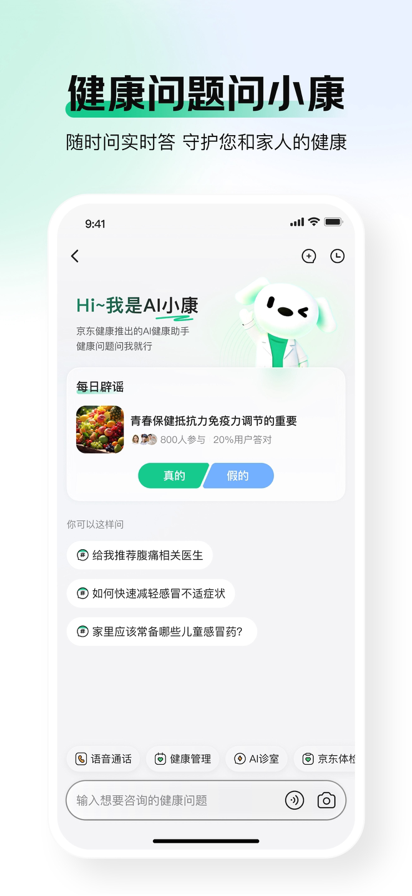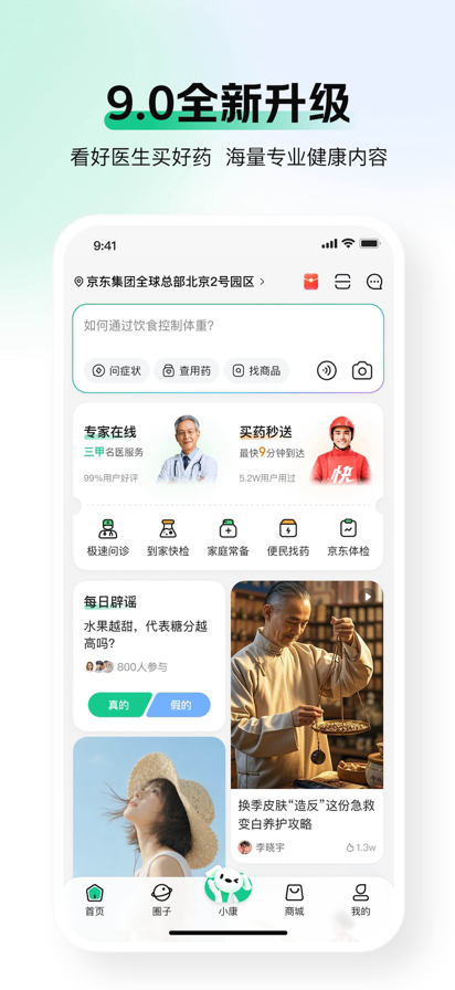 【产品介绍】 京东健康是京东集团旗下专注于医疗健康业务的子集团。依托京东集团的资源和技术优势,京东健康已经成为中国领先的医疗健康商品、服务及解决方案提供商,产品及服务覆盖医药健康全产业链、医疗全流程、健康全场景、用户全生命周期。 京东健康 APP 为用户打造涵盖“AI咨询+医疗服务+购药+社区+健康管理”的全方位专业服务体系,致力于帮助用户实现:多点健康知识少生病、有病看好医买好药、购药便捷快速。 【产品特色】 1、【康康AI健康助手】为用户提供个性化AI医疗健康咨询、AI诊室服务及检查报告/图片解读功能,依托超过4000万份医学指南与文献构建的循证医学库。基于用户健康档案和历史咨询,康康会智能输出定制化健康方案,帮助用户科学做出健康决策。同时,康康整合了全场景服务资源,覆盖挂号预约、在线医生问诊、到家快检、京东体检等服务,为用户打造“医+检+诊+药”一站式解决方案。康康AI健康助手全方位守护用户的健康。 2、【医药】为用户提供一站式线上问诊、医疗检查和购药服务。线上问诊覆盖在线问诊、专家义诊、皮肤专科等真人医生服务,足不出户解决健康问题;医疗检查包含体检、到家快检、齿科、基因检测、疫苗预约等消费医疗项目,全面又贴心;购药服务涵盖处方药、医疗器械、保健品等全品类,依托京东物流实现高效配送,支持28分钟本地急送。 3、【社区】以图文、视频、课程形式呈现中医养生、母婴育儿等内容,打造健康知识社区。用户可以科学借鉴他人与专业医生的建议,分享自己的健康经验,共同打造一个健康的交流社区。 4、【健康管理】提供专属健康管理工具包,集成血糖管理、心率监测、健康档案、用药助手等10+实用健康服务工具,让用户随时随地了解自身健康状况,轻松做好健康管理。 选择京东健康,就是选择一种便捷、高效、专业的健康生活方式! 【注意事项】 绑定的设备将会同步数据到京东健康App,并被用于相关的服务。例如使用苹果手机或iPad等苹果公司的设备,为了将您的数据同步到健康档案来提供更加针对性的健康服务,经过您的授权,我们将使用苹果公司的Healthkit同步您的健康数据。 【联系我们】 有任何意见或建议,欢迎随时联系我们。 京东健康客户端:我的-设置-用户反馈 医疗广告审查证明文号:(宁)医广〔2024〕第12-17-227号
