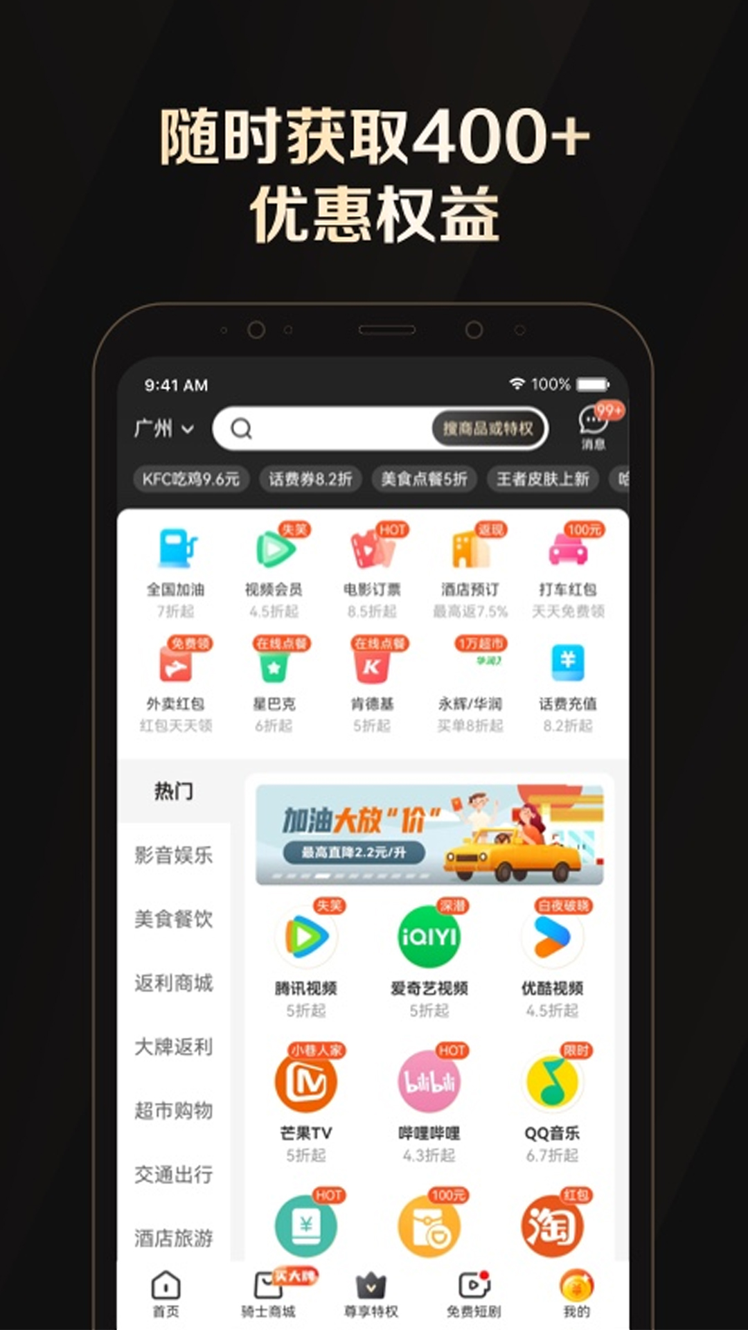 APP介绍 全球购骑士特权由广州探途网络技术有限公司发行。汇聚了国内外优质特权,是真正意义上的购物优惠券集合和特权平台。 【尊享特权】 全球购骑士特权目前已接入优质的全球尊享特权,其中包括了热门视频会员充值5折起、全国超300城加油7折起、天猫/淘宝/京东/考拉/严选购物5折起,饿了么/美团外卖红包天天领、超市购物买单 8.8折起、猫眼/淘票票电影券5折起、国际驾照免费领取、肯德基/麦当劳/汉堡王用餐5折起,新用户享100元优惠券,超抵0元购等。全球购骑士特权将会陆续接入更多独家特权。 【购物特惠】 全球购骑士特权目前共覆盖全球24个国家大牌优惠,其中包括了奥特莱斯、免税店、名品商超等购物优惠,消费低至4折; Q目前支持哪些国家使用? 目前全球购骑士特权覆盖范围包括:美国、澳大利亚、日本、泰国、新加坡、中国、德国、法国、英国、阿联酋、希腊等国家。可在APP查看到完整的城市信息以及门店优惠详情。 Q如何使用全球购骑士特权的购物优惠? 进入到APP,在“全球购物特惠”栏目选择喜欢的大牌优惠券,按照优惠说明使用即可获得折扣。更多特权持续发布中,敬请期待!