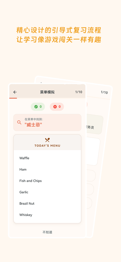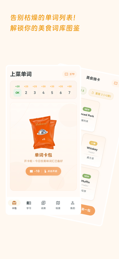 上菜单词是一款专为美食爱好者和旅行者打造的趣味英语学习应用。无论你是即将踏上异国之旅的美食猎人,还是想在日常生活中提升自己的"美食英语力",这款应用都将是你的最佳伙伴。 学习可以像开盲盒一样令人期待,记忆可以像品尝美食一样自然深刻。 让每一次旅行,都成为美食英语的奇妙冒险。 核心亮点 单词卡包 · 惊喜开启 告别枯燥的单词列表!每天签到获取"餐券",使用餐券开启精美的单词卡包。每一次开包都是味蕾与知识的双重惊喜。收集稀有词汇,解锁你的美食词库图鉴! 科学记忆 · 高效复习 采用国际认可的FSRS间隔重复算法,根据你的记忆曲线智能安排复习计划。系统会记住你对每个单词的掌握程度,在你即将遗忘时及时提醒复习——让记忆效率最大化,告别"背了就忘"的烦恼。 三步闯关 · 层层深入 精心设计的引导式复习流程,让学习像游戏闯关一样有趣: ●快速识别:四选一答题,快速检测记忆状态 ●翻卡深识:对遗忘词汇进行深度学习,配合真人发音 ●情境应用:将单词融入真实旅行对话,学以致用 真实场景 · 身临其境 精选40+旅行美食场景,每个场景都包含真实的英语对话,帮助你身临其境地学习实用表达。 学习统计 · 成就满满 详尽的学习数据让你的进步清晰可见: ●每日/每周/每月学习趋势图 ●各类别进度一目了然 ●连续签到记录与奖励加成 ●收藏夹与雪藏功能,个性化管理词汇 丰富词库 覆盖24大美食类别,超过800+精选词汇: 使用场景 出国旅行前 临行前突击学习常用词汇,让你在异国他乡的餐厅自信点单。 日常生活中 刷美食博主视频时,遇到不认识的菜名?打开"上菜单词"一搜即知。 备考学习时 无论是雅思口语还是商务英语,美食话题都是高频考点。 休闲娱乐时 把碎片时间变成学习时间,游戏化积累词汇。 用户心声 "终于有一款专门学美食英语的App了!出国旅游再也不用对着菜单发呆了~" — 美食旅行爱好者 "开卡包的感觉太上头了,每天都期待着看看能抽到什么词" — 学生党 "场景对话特别实用,感觉学的很多词都能马上用上" — 商务出差人士 立即下载 开启你的美食英语之旅,让每一次用餐都成为一堂生动的英语课!