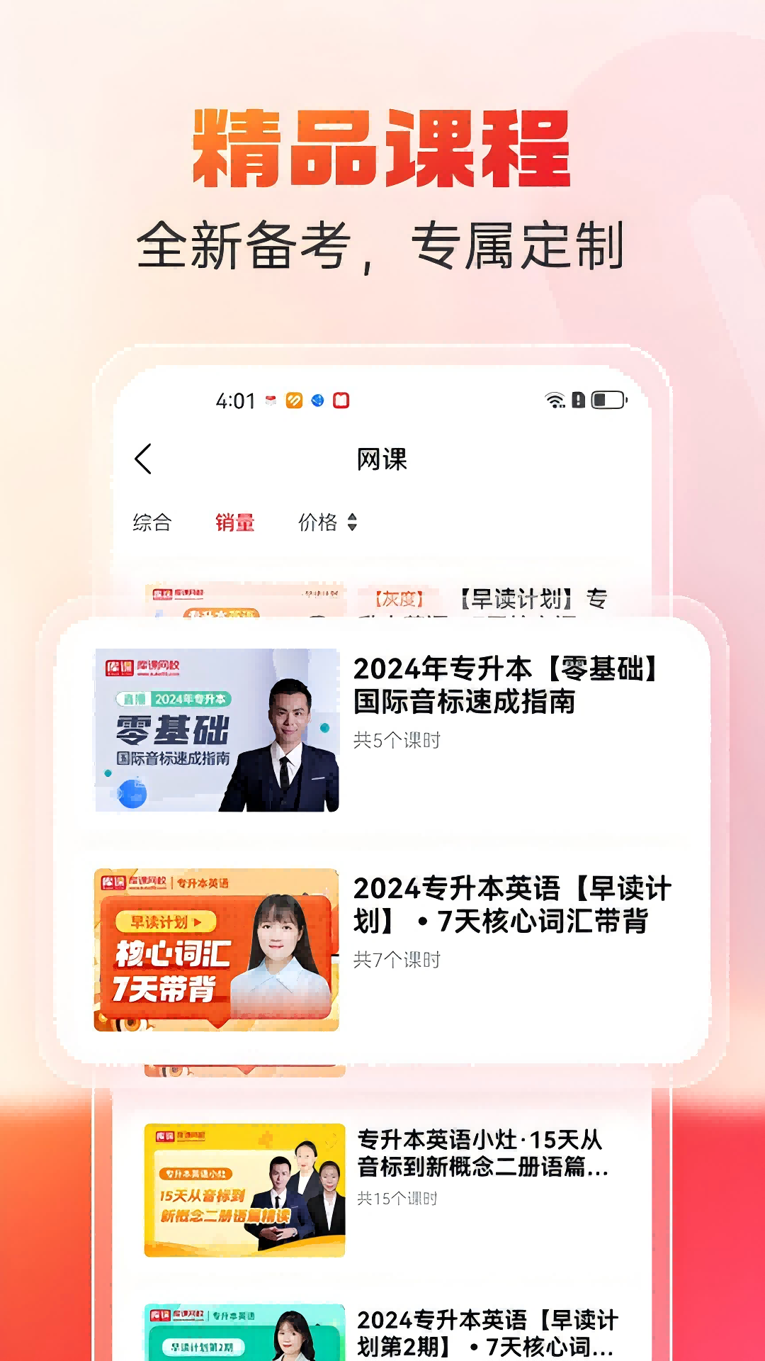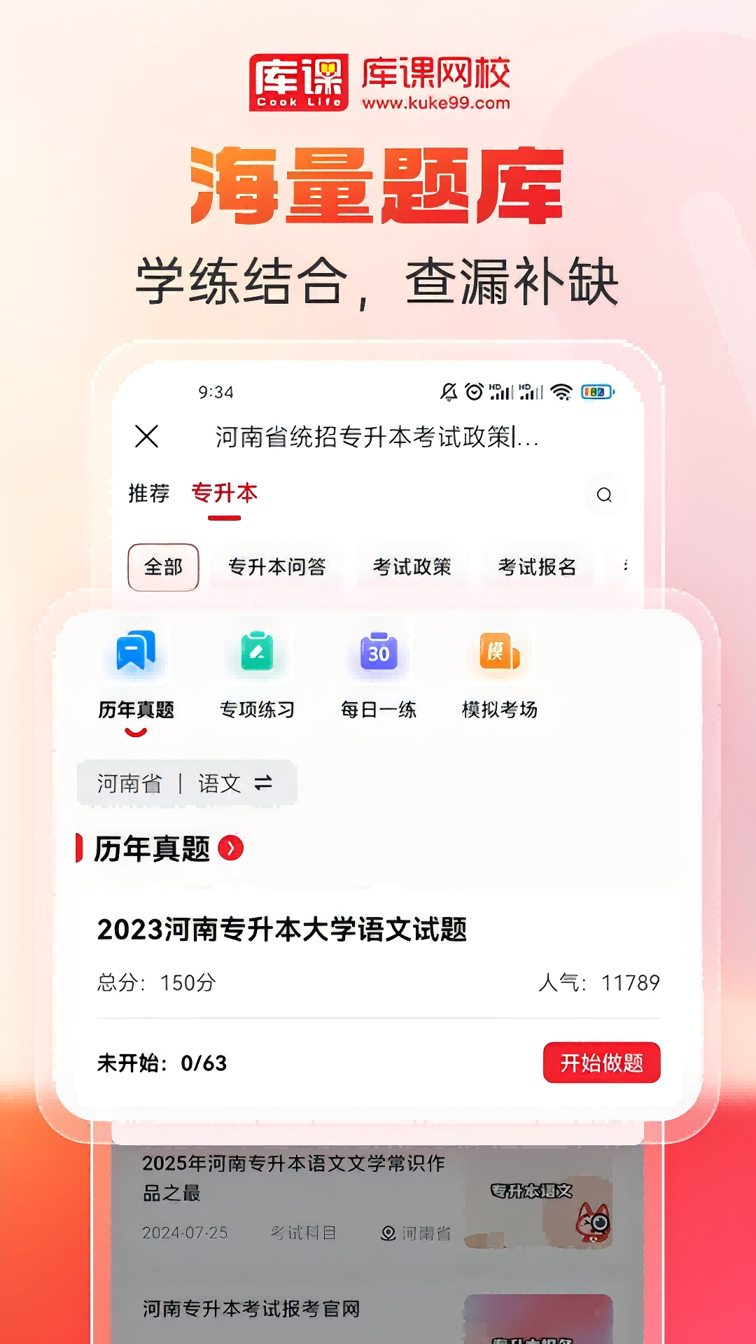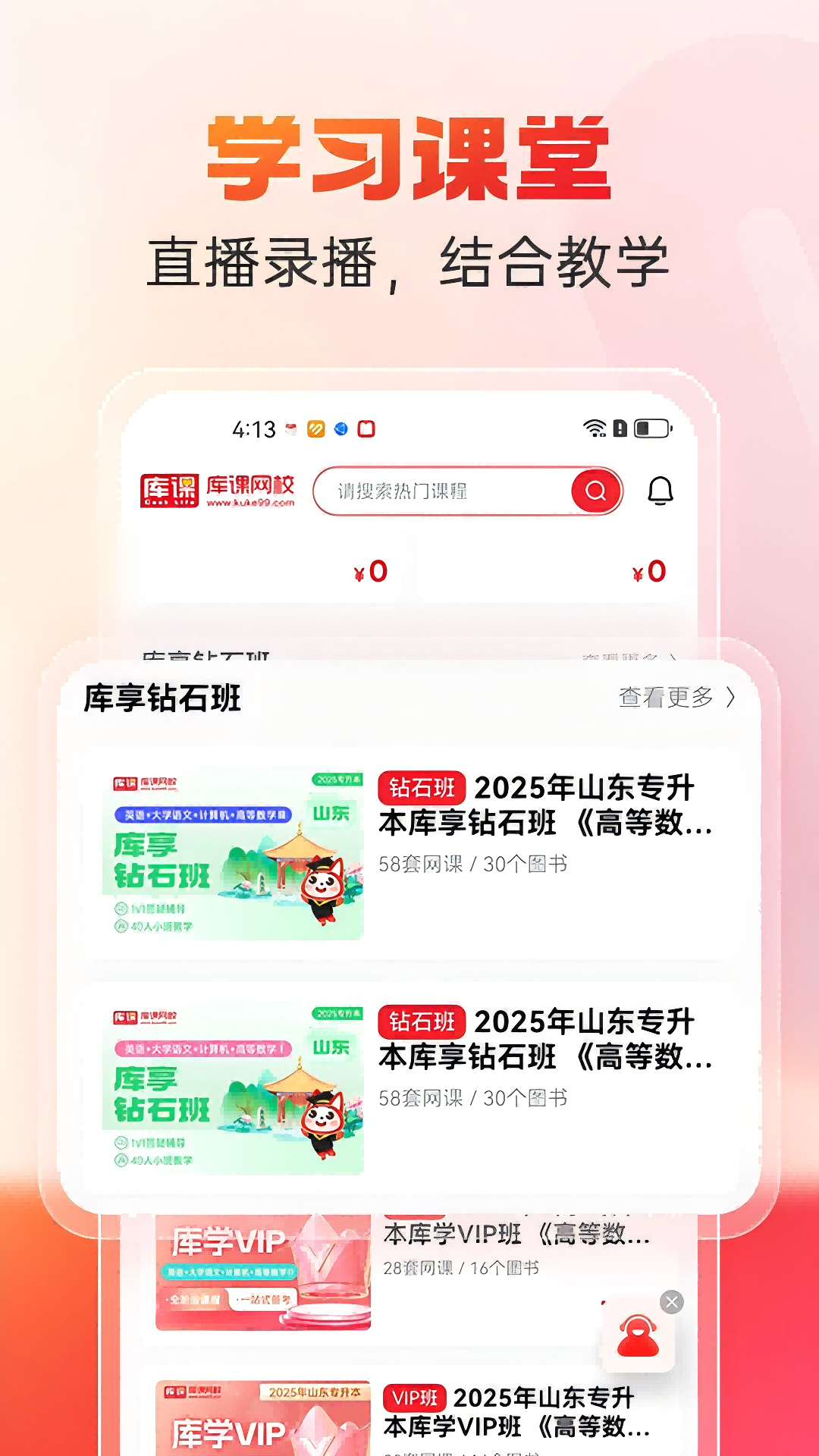 库课网校APP,为统招专升本、教师资格、教师招聘等考生提供在线课程/题库/图书和考试资讯的在线学习平台。 【六类资源助您成功】 直播课堂、班型套餐、在线题库、精品图书,随时随地,开始学习!课程、题库、图书、资讯,线上线下,资讯实时推送! 【六大科学课程体系】 VIP高端班、钻石班、全科基础班、单科进阶班等班型,以及基础精讲课、强化直播课、题海提升课、真题详解课、考前冲刺课等单科课程,总有一款适合你! 【丰富多样课程】 涵盖公共英语、高等数学、管理学、教育理论、计算机、等专升本考试课程。 【直播录播结合教学】 在线学习,实时互动。录播课,支持批量下载、倍速播放,学习节奏,自己掌握! 【在线考试学练结合】 练习考场、模拟考场、真题考场。自动阅卷,生成测评报告,提供个性化提升建议。 【大平台,值得信赖】 580+一线辅导教师,实时互动,线上答疑; 400+课程任你挑选,多方法、多模式教学; 20万+试题供你做题巩固,学练结合! 库课网校,为天下学子成就美好人生!