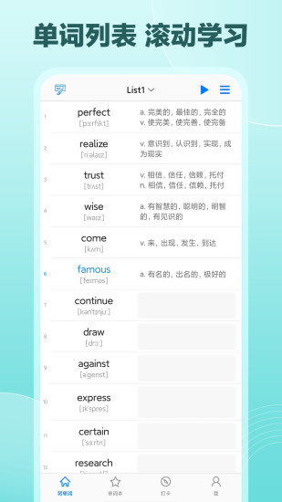 List背单词,做一款简洁的记忆单词软件。 功能特性: * 「内置词库」:小学/中考/高考/四级/六级/考研/考博/专四/专八/雅思/托福/GRE/SAT/GMAT/BEC/MBA/托业/专升本/Coca/全国英语等级考试PETS/剑桥英语考试KET/PET/FCE/ACT/成人本科/自学考试/朗文词汇/牛津词汇/全国大学生英语竞赛/新概念英语/英语应用能力考试AB级等词库; * 「学习计划表」:根据艾宾浩斯记忆规律曲线,持续记忆和不断复习; * 「自定义词库」:支持外部文件导入; * 「双语/单语」:快速切换双语/单语模式,自查自测; * 「词典查询」:内置在线词典(英汉/英英),支持“用户自行添加在线词典”; * 「英式/美式」:支持英式/美式发音+音标; * 「多种排序」:支持随机打乱等多种排序方式; * 「生词本」:汇总重难词,集中强化记忆; * 「熟词表」:移除熟词,词库越学越小; * 「学习数据备份与恢复」:新旧手机记录同步,学习进度不丢失; * 「听写模式」:可重复可间隔可循环可自动,全屏模式,后台播放音频; * 「拼词模式」:卡片点选字母拼词,同时支持键盘输入。