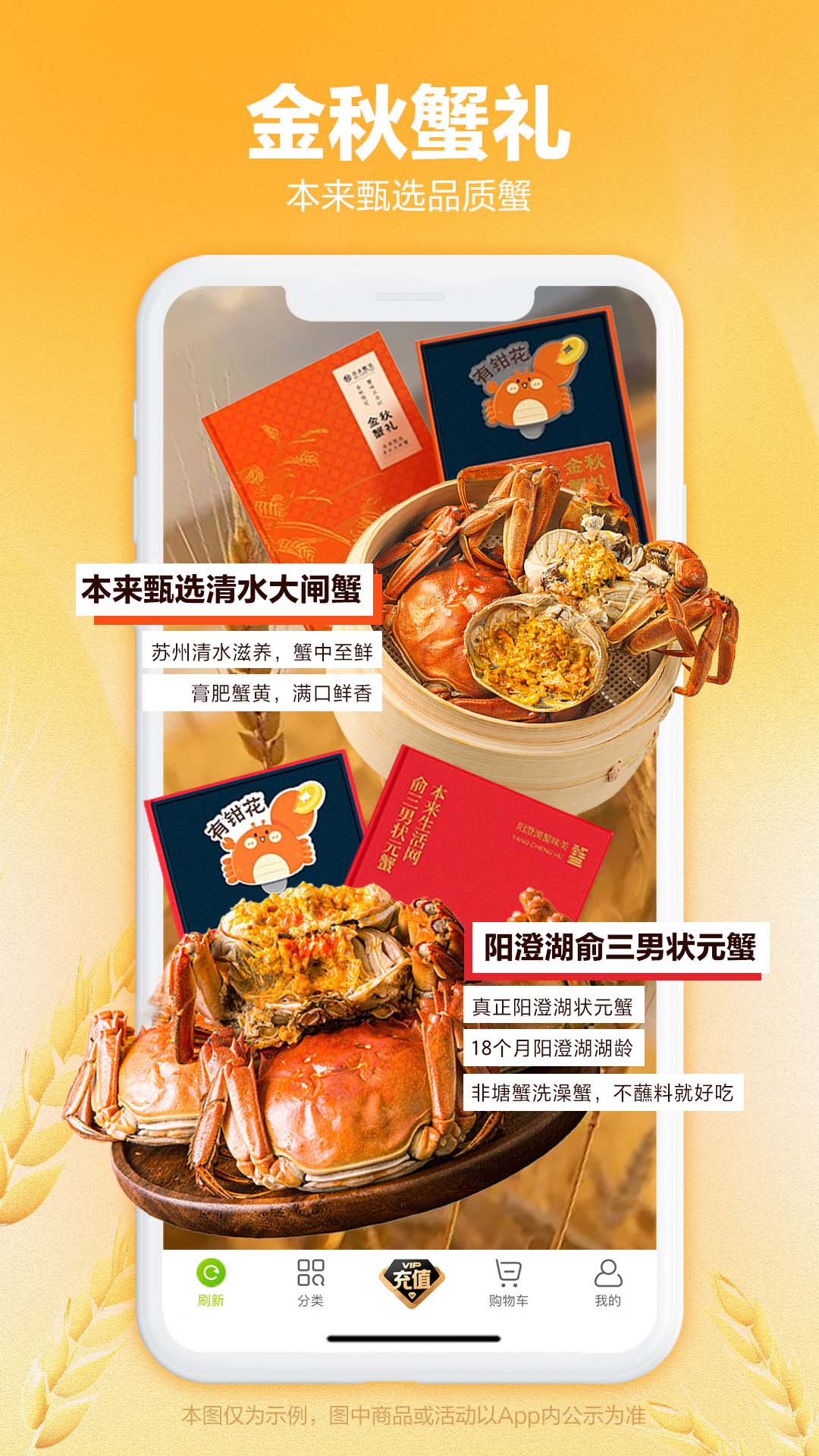 中国品质生鲜DTC电商网站-重塑中国农产品的尊严与价值<br> <br>新人好礼:享首单低价优惠 尝当季食材<br>天天低价:每日必抢、折扣低价享不停<br>品质生鲜:褚橙、阿克苏100冰糖心、李玉双有机稻花香,等优质农产品<br>冷链到家:今夜达、次日达,冷链商品全程低温配送到家<br> <br>爱吃会吃懂吃,满足你的多样需求<br>-本来生活网始终致力于改善食品安全现状、倡导健康生活方式,商品总数量15,000多款,全球买手超过200位。打造了褚橙、阿克苏100冰糖心、甘肃庆阳苹果、李玉双有机稻花香、俞三男状元蟹,等一系列优质农产品品牌。<br>-扶贫,我们是认真的!脱贫攻坚以来,本来生活以集团之力,积极开展电商扶贫及消费扶贫。截止目前,购销了扶贫农产品10亿多元,带动上万贫困户增收,惠及10万余农户。<br>探索出“政府+电商+帮扶企业+合作社/龙头企业+贫困户(农户)”的五方联动本来扶贫3.0模式,实现有效帮扶,助力贫困地农产品销售并推动当地农业产业可持续发展,让良心农人,得到良心回报!
