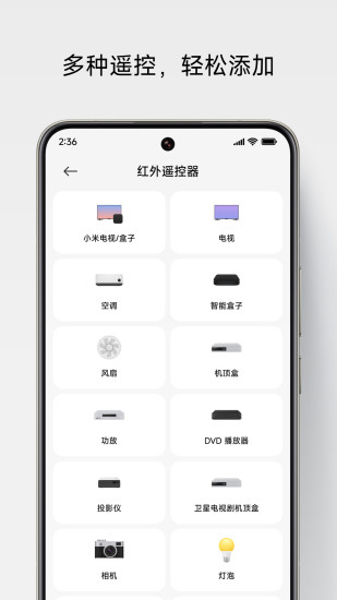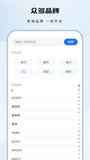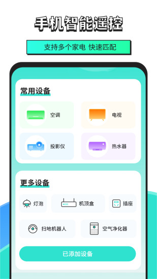 手机遥控器不仅仅可以适配各个品牌型号的空调,还可以遥控电视,风扇等常用电器。 红外码库内容丰富,不必再为缺少自己的型号而烦恼。 支持多款家电设备,包括:空调、电视、机顶盒、音响、投影仪、风扇等多个设备。 空调品牌,型号收录众多!不光是大品牌,格力,美的、海尔等型号。 电视按键功能匹配!让您大片看不停,享受视听。 电扇等电器的遥控功能,拓宽了您遥控器的使用范围! 红外功能完美解决方案,让您彻底了解手机功能,轻松使用遥控器! 多选择适配,每个家电中都有超多品牌供您选择,总有一款可以适配成功。 让您的手机变身超能小助手!无论走到哪里,都可以打开适 配的家电设备。让你体验更智能更便捷的生活方式,简单不复杂, 一键遥控家里的家电,远离有线烦恼。