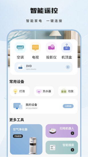 一款先进的智能应用,以其强大的功能和简洁的操作界面,让您成为真正的万能遥控大师!无论是控制您家中的电视、空调、音响,还是支配办公室的投影仪、电脑等设备,掌控万能遥控器精灵都能帮您解决繁琐的遥控器困扰。 主要特色: 广泛兼容:支持几乎主流品牌的电器设备,包括电视、空调、音响、DVD等。无论您的设备是哪个品牌,我们都能为您找到相应的遥控器码库,让您能完美掌控。 海量遥控:应用拥有庞大的遥控器码库,涵盖了各地的电器品牌和型号。您只需进行配对,即可找到适合您设备的遥控器,轻松实现万能遥控的目标。 用户自定义:个性化遥控器布局,您可以根据自己的喜好和习惯,定义房间名称和电器。可以添加、删除、编辑按钮,打造属于自己房间的定制遥控器,让您的控制体验更加方便和高效。 旨在为您带来无缝的遥控体验,减少遥控器数量和繁琐的操作步骤。快来下载这个终极遥控器应用,让您的手机成为掌中宇宙,尽享智能控制的便捷和乐趣!