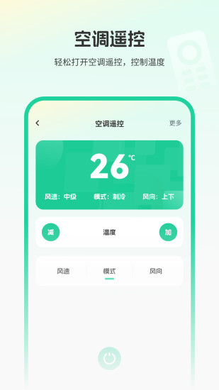 万能手机智能遥控器是一款功能丰富的软件,主要功能支持空调/电视等各种家电遥控,支持查看黄历,节日节气。 1.手机遥控器操作简单,用户直达遥控界面,打开软件,一键匹配,下载就能使用,模拟真实遥控器按钮触感,信号损失更低,云端存储红外码库数据,人性化遥控界面,智能化快速搜索,实时用户反馈,解决用户需求。 2.空调遥控器具有历史设备功能,一次匹配,永久使用,支持自定义遥控器名称,自定义地点,支持上百种家电品牌型号,下次使用更加方便快捷,无须担心重复匹配问题。 3.空调遥控器还添加了万年历功能,一历在手,万历皆有!适合中国人的万年历,集日历、农历、记事、提醒于一身的生活好拍档,知未来,看历史,洞悉世界大事。传统黄历宜忌:关注每天该做和不该做的事情,出门看老黄历,事半功倍;专业择吉通胜:帮您精准挑选个好日子结婚、开市等,办事挑好时,事事顺心;历史上的今天:知古往今来,知兴衰转换。