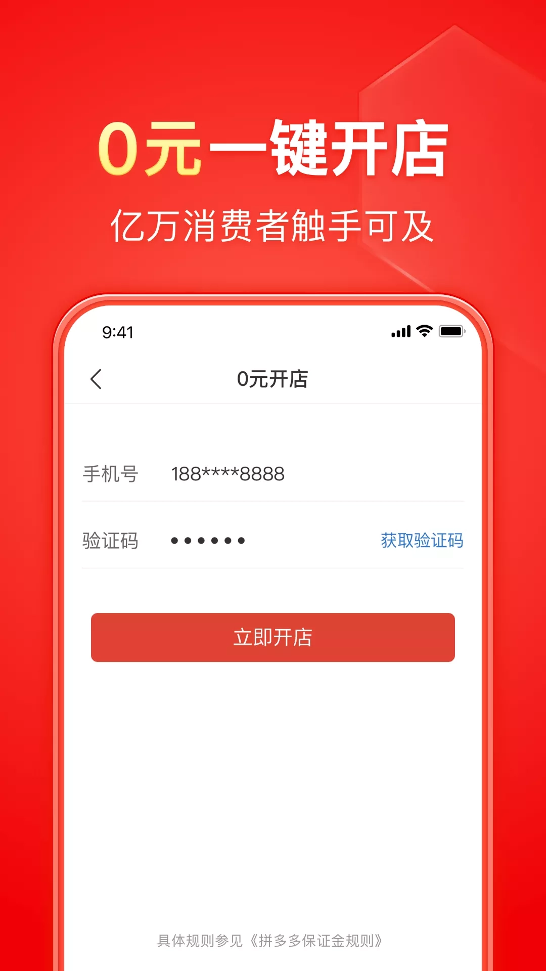 【拼多多商家版:0保证金开店,坐享亿万用户】 拼多多官方推出的手机版店铺管理平台,1分钟掌握店铺动态,1站式搞定日常经营! ---功能简介--- 【真正0元开店】0保证金经营,手机1秒极速开店 【多店铺经营】可同时管理多个店铺,1键切换 【多渠道营销推广】免费活动流量及精准推广渠道,助您快速爆单 【高效客服工具】随时随地回复顾客咨询,不错过1个客户 【订单统一处理】待处理订单及时跟进,不错过1个订单 【数据尽收眼底】核心业务数据一览无余,生意走势一手掌握 【商品精准运营】基于大数据精准选品,高效运营有的放矢 【丰富营销工具】丰富的营销玩法快速提升店铺转化 【资金极速提现】快速充值极速提现,资金流水一目了然 【百万商家社区】与百万商家交流经营干货,长知识有温度 【贴心官方服务】新手快速入门,专业客服为您贴心服务 -倾听你的声音- 使用过程中遇到任何问题,请联系我们 【微信公众号】搜索关注微信公众号—拼多多商家服务:pddsjfw 【在线客服】进入拼多多商家版>我的>在线客服 【意见反馈】进入拼多多商家版>我的>设置>帮助与反馈>反馈 感谢商家朋友们不断提出的宝贵意见,我们一直在努力倾听并持续改进!