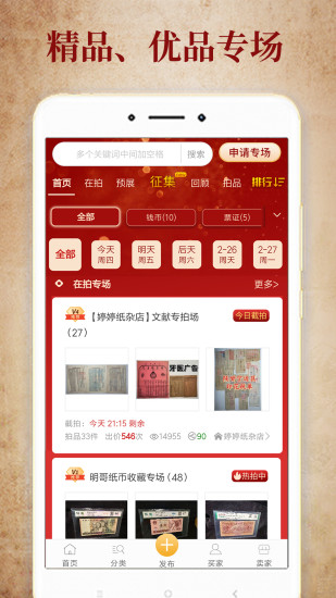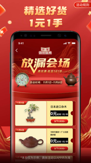 焱十一致力于全球艺术与文化的融合和传播、打造多元化的艺术社区,为艺术从业者、收藏家和爱好者构建更专业、更高效、多品类、有品质保证的综合性线上拍卖交易平台。 平台凭借精湛的网络科技、专业的服务、严谨的工作态度,联合全球优质拍卖行,提供中国古董艺术、西方艺术品、珠宝腕表、艺术家居、日本及其他亚洲艺术、以及各种趣味收藏的海量精品,生货频出,同时大数据精准推送,让国内的买家足不出户、一键直达心仪的拍品,轻松同步参与海内外的优选拍卖会。 产品特色: 1、【跨境拍卖,收藏无界】汇集全球优质拍卖行和优选拍卖会,足不出户即可全球寻宝。 2、【品类多样,中西合璧】汇集品类丰富的中、西方艺术品和收藏品,总有一款是您想要的。 3、【海量信息,精准推送】海量拍品,生货频出,极速检索,大数据推送,轻松捡漏。 4、【优质拍行,一触即达】具有影响力的优质拍卖行和权威艺术机构签约入驻,提供有品质保障的拍卖会。 5、【极致优化,易于操作】平台提供网页、APP、微信及移动端等多个终端,友好的产品体验,前沿的互联网技术,让您随时、随地、随心同步参拍。
