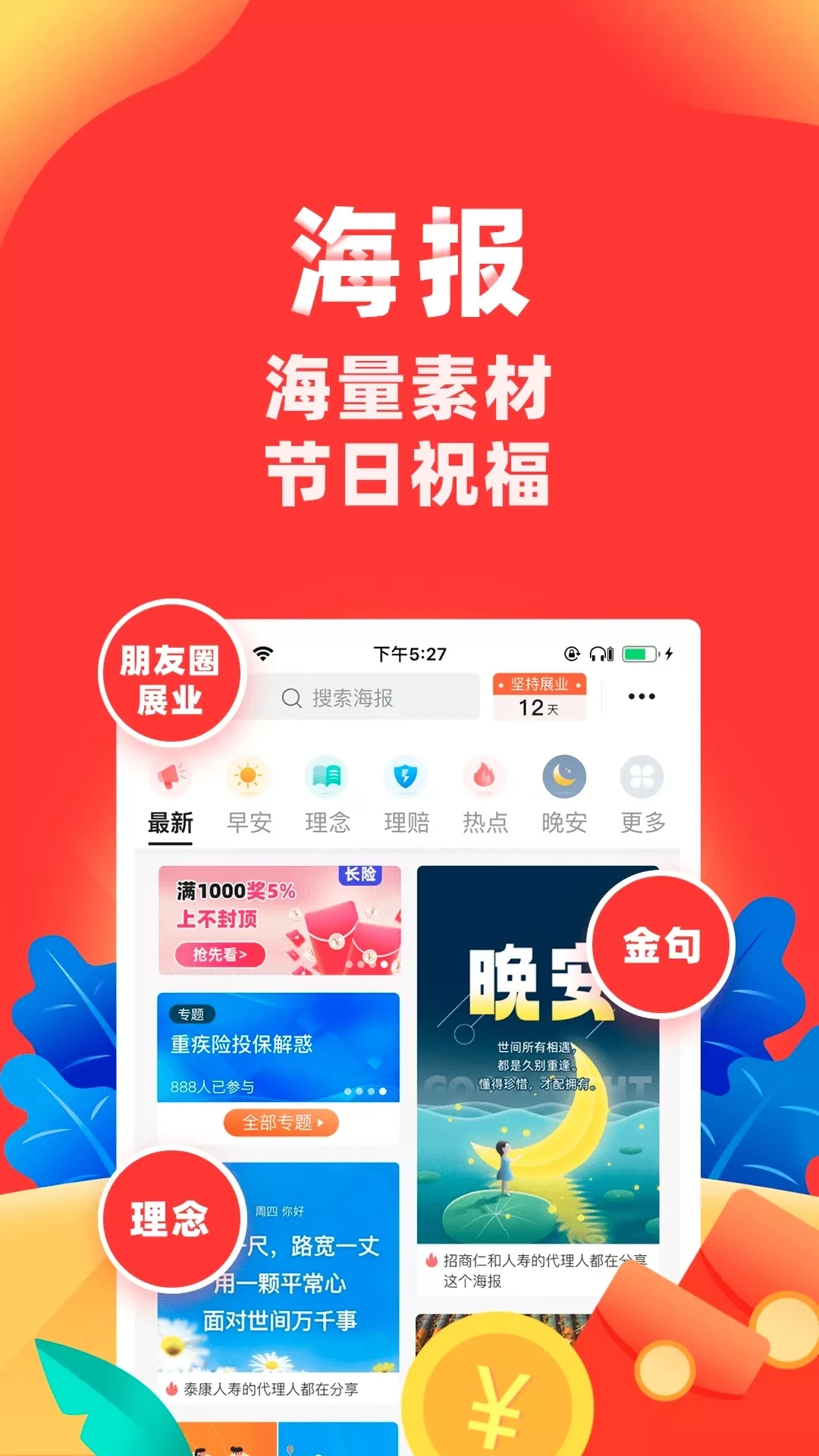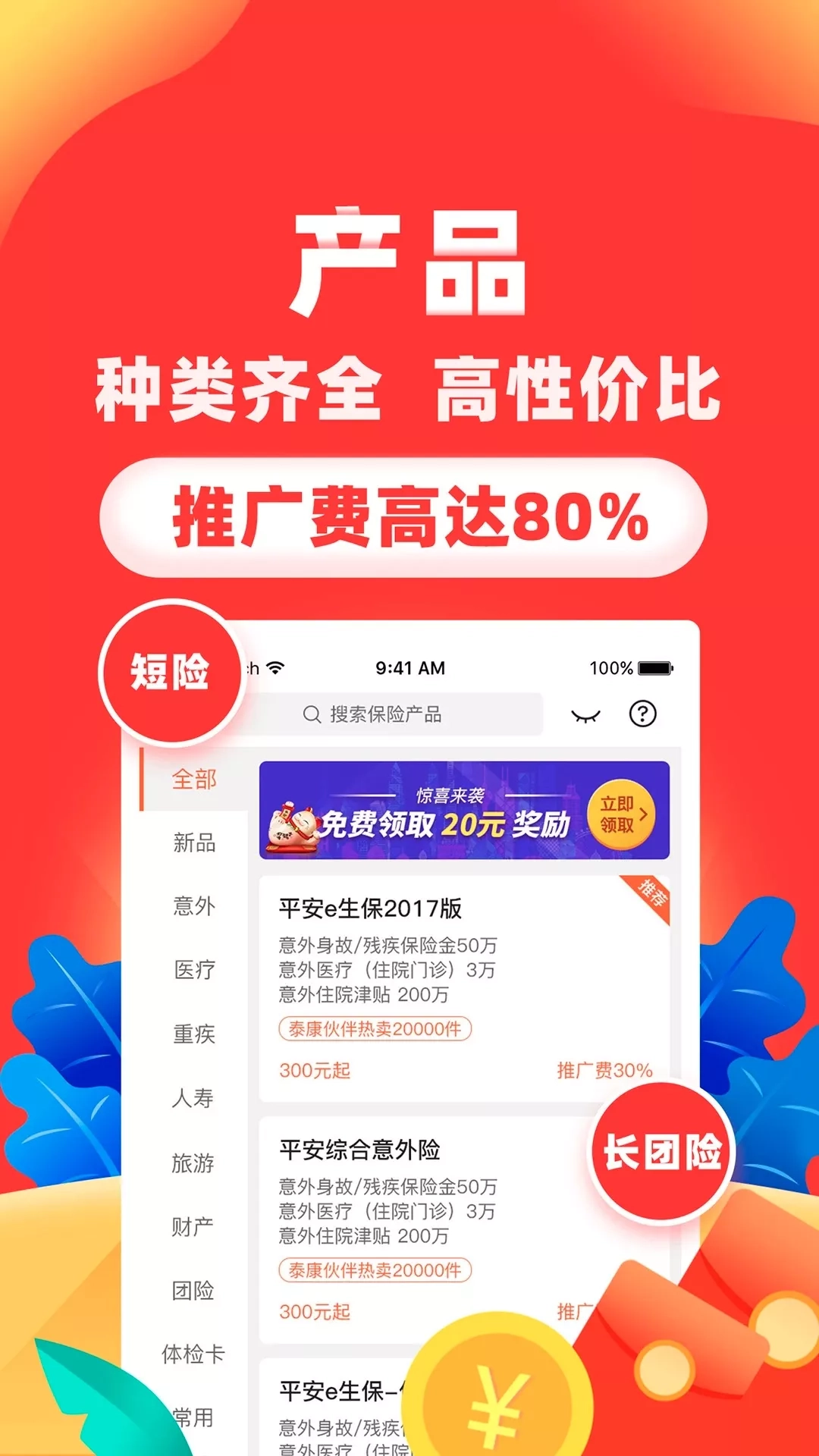 300万保险代理人都在用的神器 1.【产品】专属保险产品,种类多又全,高性价比。推广费达80%。 2.【计划书】保障条款清晰,保费测算零误差,利益演示更准确。 3.【海报】海量素材,节日祝福。一次分享引爆朋友圈,客户时刻关注你。 4.【技巧】详解各类爆品,图文并茂、案例清晰。大咖手把手教你怎么卖保险。 上不封顶的高额推广奖励 5.【新手专享】新人即可获得30元现金奖励。 6.【会员体系】提升会员等级,获取高额签单奖励金,最高超过400元/单哦! 7.【邀请有奖】一次邀请,持续获利。每次好友出单(须签约),您均可获得推广费提成10%。