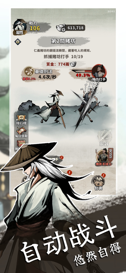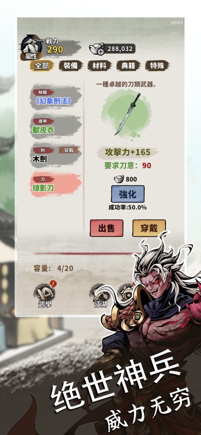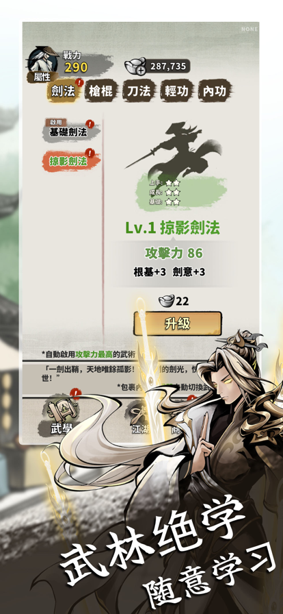 这是一个经典的武侠世界,集冒险、奇遇、养成、策略等众多玩法一体的RPG游戏。少侠可与江湖豪杰携手闯荡江湖,共同研习绝世武功,贯穿任督二脉,登顶武学顶峰,打造属于你的武林神话! [数百武功尽情研习] 多达200+种武功自由搭配,洗髓、太极、道藏、纯阳孰强孰弱? [知名豪侠悉数登场] 多达200+名江湖豪侠悉数登场,义结金兰携手仗剑江湖。 [正经奇脉任君组合] 十二正经与奇经八脉自由突破,贯穿任督二脉神功大成。 [江湖历练巧获机缘] 邂逅传奇大侠,收获绝世神功、独门丹药等奇遇馈赠。 [生活技艺另辟蹊径] 采集药材,炼制丹药,激发潜在天赋。 挖掘矿石,打造神兵,助力功力倍增。 [秘籍装备全图掉落] 所有地图全随机掉落,绝世武功秘籍、神兵利器静待有缘人。