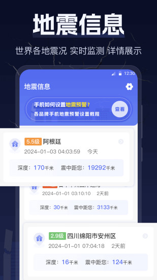 【实时地震信息查询】:用户可以实时查看全球范围内的地震信息,包括震级、深度、震中位置等关键数据。 【灾害预警】:除了地震预警外,应用还提供其他灾害如台风、洪水等自然灾害的预警信息,全面覆盖各类可能的风险。 【应急避难所】:在地震发生时,应用会显示附近的应急避难所位置,指引用户快速找到安全的避难场所。 【设置指南】:针对不同品牌的手机,应用提供了详细的设置教程,帮助用户快速开启地震预警功能。 【预警科普】:应用内含丰富的地震知识科普内容,教给用户如何正确理解和应对地震预警信息。 【求生工具】:集成了多种紧急情况下的生存工具,包括指南针、SOS手电筒、天气查询、紧急电话和分贝仪等,确保用户在危机时刻也能保持方向感、照明和通讯能力。 通过这些功能,地震APP不仅在灾难发生前提供预警科普,而且在灾难发生时提供实时信息和救援工具,增强用户的自救能力,为全家的安全增添一份保障。让我们共同面对自然灾害,保护自己和家人的安全。