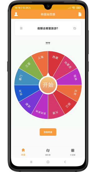 小决定大转盘,让决定更速度,更有趣味。 支持分享决定了~ 把你做的决定分享给你的好朋友吧。 选择困难症?纠结?犹豫不决? 这里有各种好玩的选择小游戏 大转盘、摇色子(掷骰子)、抽签、指尖轮盘、抛硬币让你告别选择困难症手机选择器。 随机数功能,支持设置包含、排除,限定范围、指定数量。支持大数值的随机数,一次最多生成上万个随机数。 随机数列表一键拷贝,分割符号随心切换,好玩到停不下来 聚会无聊?吃饭抢着买单?不知道今天穿啥(吃啥)?纠结放假去哪玩?想抛硬币却没有实物?...... 容易纠结的你,是否经常犹豫不决,以至于影响了一天的效率和心情?现在,选择困难症小伙伴们的好帮手来了——你的一切纠结,都交给「决定大转盘」吧! 多种游戏、多种玩法,自定义主题,满足你个性需求,让你的决定不再单调!