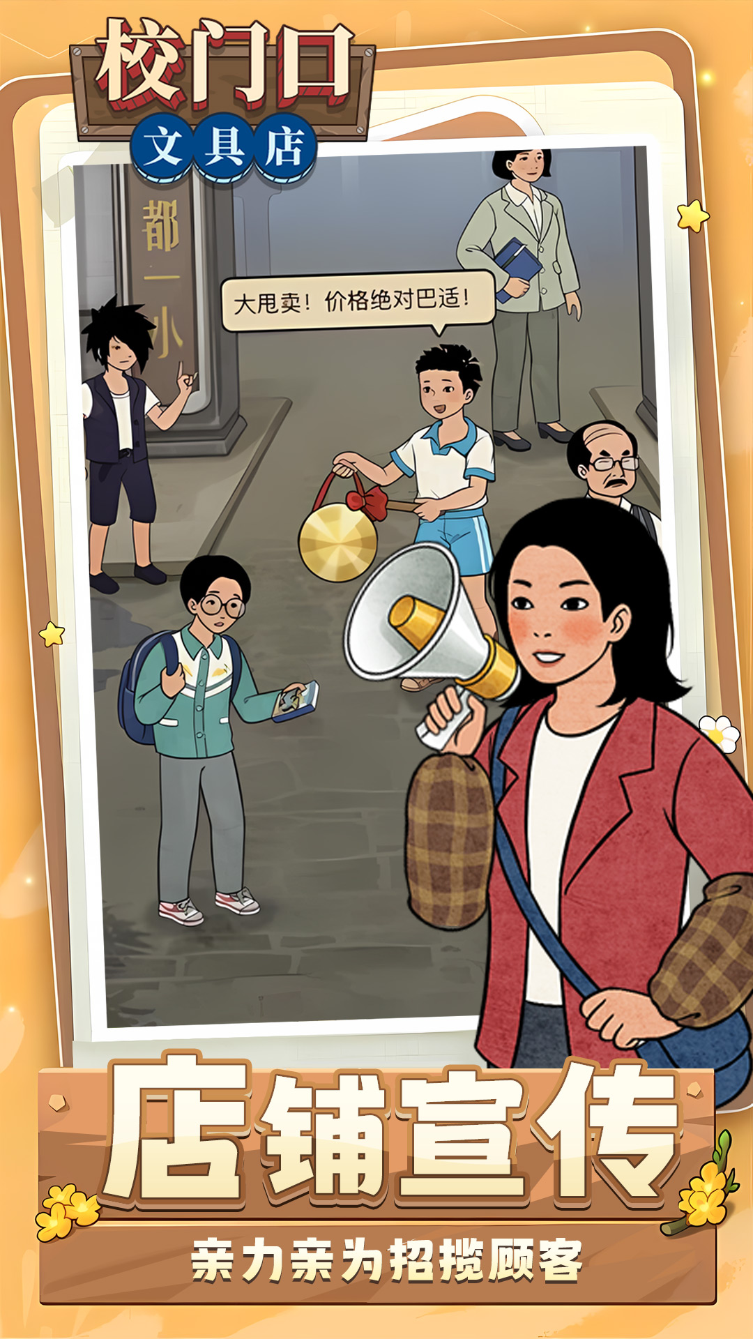《校门口文具店》是一款怀旧模拟经营游戏,搭载怀旧的90年代场景,配合Q萌2D风格人物建模,让你重拾学生时代的快乐记忆。在游戏中,你化身学生王小明,课余时间协助家人在校门口开了一间文具店。从拔除杂草装修文具店,到挑选文具用品进货、宣传店铺吸引顾客,桩桩件件的事情都需要你亲力亲为。总之就是,这个店没你不行!<br><br>铁皮铅笔盒、橡皮泥、七个小矮人、绿舌头..从文具到玩具、冰淇淋,都是90年代独有的回忆。光顾文具店的棒棒娃、王小花等身着白衣校服的同学也将让你秒回学生时代。快来游戏里寻找你学生时代的快乐时光吧!<br><br><br>游戏特色:<br>- 情景再现90年代校门口文具店真实状态;<br>- 细节还原儿时受欢迎的文具用品、心动玩具;<br>- 策略经营,机智宣传,将文具店做大做强创辉煌;<br>- 俏皮亲切的人物对话,沉浸式体验模拟经营乐趣;<br>- 上手超简单的单机小游戏,好玩到停不下来。