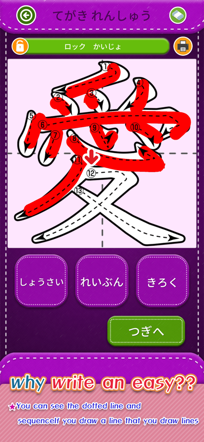 此应用程序可学习三年级的汉字字符200。既然中国学习小学三年级的课程,谁想要学习或背诵日本(日本字)汉字可以简单轻松地使用。 2010年以来,超过N3 JLPT汉字层次越多,记这么一句话的问题的范围不仅是公众会认为包括在日本1026中国字符,直到六年级一年级的问题。此应用程序将被考虑,以及中国和包括自具有很大的帮助那些谁的JLPT准备考试形式会的问题,真正的问题在日本使用的例子。 -书写练习- 由于订单的书面文字中国的方向练习写作有明确标有虚线订单号的信能够学习如何在同一时间的日语汉字书写学习文字优美的法律权利。 -测试模式- 之后,日语汉字的做法可以肯定的是您正确研究了测试模式手写练习。 -世界纪录挑战- 如果通过测试模式中,你可以与他人的世界记录模式竞争。 可以自信地推荐给您无后顾之忧的学习日语的基础上的程序。