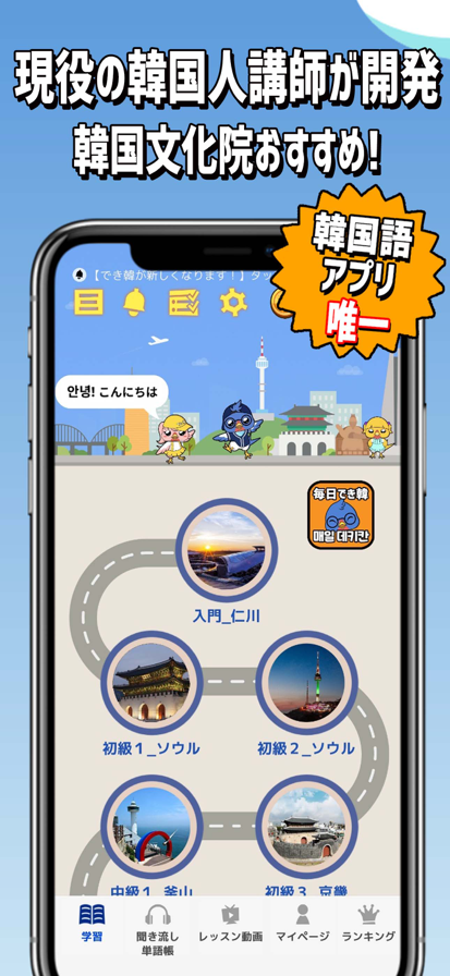 K-POPアイドルが好きですか?韓国ドラマを字幕なしで観たいですか?1回3分!無料韓国語学習アプリ「でき韓」でハングルから、単語と文法、発音まで独学し、会話力アップを目指しましょう! でき韓は「唯一」の韓国語学習・勉強アプリです。 ・日テレ、韓国文化院がおすすめ ・韓国語は韓国人に、現役の韓国語講師が開発 ・韓国語アプリ世界初!コンテンツが毎日追加 ・単語と短文、韓国語アプリ最多! ・初心者から上級まで、体系的な文法解説 ・先生に何でも聞ける「パク先生におまかせ」 単語、聞き取り練習なら「でき韓」 ・語彙力は言語力!3000個以上の単語と短文 ・日常会話で韓国人が使う必須単語を厳選 ・全ての音声は機械音でない生のもの ・聞くだけで覚えられる「聞き流し単語帳」 ・オートリスニング、1/2倍速再生機能で単語を楽に暗記 最も効率的に、手軽に!韓国語勉強・独学なら「でき韓」 ・ハングルから単語、文法、発音まで学べる ・レッスン動画と連動、初心者から上級まで対応 ・録音/自動再生機能でネイティブの発音が身に付く ・「今日のクイズ」で毎日復習させてくれる ・ユーザー満足度96%!有料より良い無料アプリ ・各ステップは2~3分で完結!スキマ時間が勉強の時間に 字幕なしで韓ドラが見たい、韓国アイドルのメッセージが知りたい、でも、韓国語教室は近くになかったり高かったり・・と悩んでいますか?無料アプリで、いつでもどこでもハングルを勉強しましょう。 ◉通常30分間の有料オンライン講座を1ステージに凝縮!話す力、聞く力(会話力)が最短で身に付きます! ◉入門・初級・中級、細かいレベル分けで初心者から上級者まで楽しめます。 ◉各ステージをクリアし、観光名所カードを獲得していきましょう! ◉ハングルの組合せボード、聞き流し単語帳、録音など、様々な機能があなたの勉強をサポートします。 ◉K-POP、韓ドラ、スラング、ビジネス、クイズなど、興味に合わせ、楽々進められます。 ◉可愛いキャラクター達が褒めたり励ましたりと、あなたを応援してくれます。