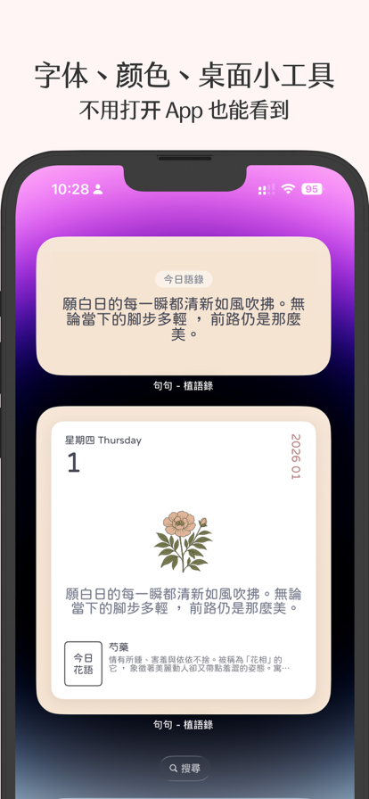 每天一句话,也能温柔地改变一天。 《植语录》是一款将每日语录 × 植物插画结合的治愈系陪伴 App。 每天打开应用,翻开一页日历, 遇见一段为今天准备的文字,以及一株植物的故事, 在忙碌与焦虑之间,为自己留下一段安静的时刻。 每天的治愈仪式 - 每日一则精选中文语录 - 搭配精致的植物插画与花语含义 - 像翻日历一样,迎接今天的情绪与心境 收藏与分享,记录当下 - 收藏你喜欢的语录与植物组合 - 一键生成精美图片,轻松分享 - 把重要的话,留给未来的自己 打造属于你的风格 - 自由调整字体与背景颜色 - 桌面小组件(Widget),每天温柔提醒 - 创建只属于你的语录画面 高级功能(订阅) - 解锁完整花语内容与彩色植物插画 - 无限收藏你喜爱的语录 - 更多字体与个性化设置 - 提供 7 天免费试用,可随时在 App Store 管理或取消订阅 如果你愿意, 让《植语录》成为你每天打开的第一个温柔角落。 -- 高级功能需订阅(按月或按年,自动续订)。 费用将在确认购买时通过 Apple ID 收取,并会在当前订阅期结束前 24 小时自动续订。 如需取消订阅,请在到期前前往 App Store 账户设置中进行管理或取消。 隐私政策:https://moodquotes.bolt.host/privacy 服务条款(EULA):https://www.apple.com/legal/internet-services/itunes/dev/stdeula/