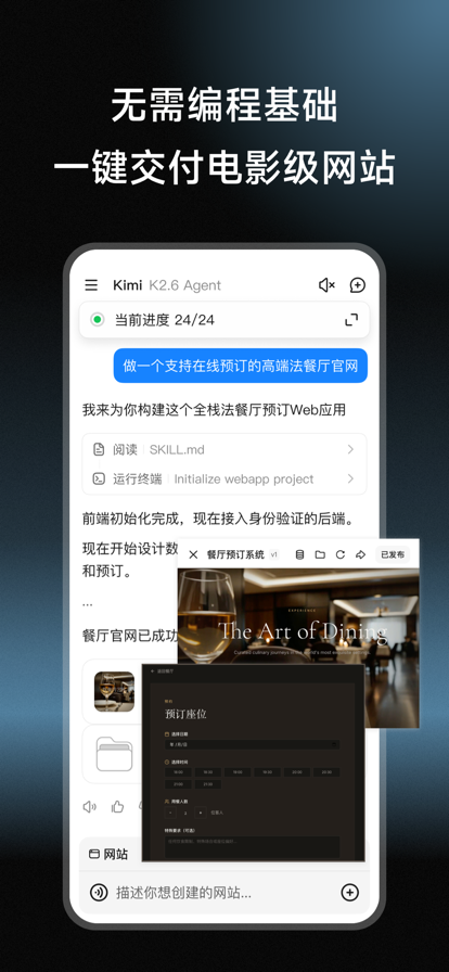 Kimi K2.6模型上线!一句话交付电影级品质网站,自带数据库与账号体系,让创意直接落地。你现在还能给龙虾们拉个群聊,agent团队协作效率再次升级。此外,对话中生成的优质产物可一键转化为专属Skill,轻松实现工作流的沉淀与复用。 # Kimi 能帮你做什么 - Claw龙虾群聊「Beta」:现在你可以直接给龙虾们拉个群聊了,还可以邀请你的真人朋友们在群内实时交互与并行协作。真实还原一人公司的协同工作流,让复杂项目的交付效率再次实现跃升。 - 更懂审美的编程:一句话交付电影级品质网站,自带原生数据库与账号体系。让创意快速落地 - K2.6思考:支持多轮工具调用与思考,能逐步攻克数理逻辑难题,让搜索更广更准,帮你把想法化为清晰、富于创意、可用性高的文字与代码。 - Kimi Claw: 零配置免部署,无需硬件成本,一键解锁你的个人云端智能体。支持 7×24 小时定时任务与深度长期记忆,越用越懂你。无论是自动抓取资讯、整理资料,全自动接管你的复杂工作流。 - PPT:支持直接上传视觉参考,Kimi 即可定制你需要的视觉风格。一键生成排版专业、高度个性化的PPT。 - Agent 集群: AI开始使唤AI干活了。Kimi现在也懂得创建自己的分身了!无论是海量文献综述、全网深度调研,还是超长行业研报撰写,它都能根据任务需求,现场调度多达 100 个分身,并行处理 1500 个步骤,将原本耗时的工作压缩至分钟级交付,实现 10 倍以上的效率提升。 - Office办公:Kimi 开始精通Office了!不仅支持 PPT、Word、Excel 与 PDF 的无损互转,更具备人类专家级处理能力:自动编写 Excel 复杂公式与图表,能够胜任Word/PDF 的专业排版与批注。 结合自主规划能力,它能智能调用多种工具,深度完成产品方案、网站搭建等全流程工作。繁琐的执行过程,交给Kimi Agent就好。 - 视觉编程: 告别代码门槛,对话即开发。支持上传设计稿、手绘图甚至操作录屏,K2.6能精准识别视觉细节,自动生成结构清晰、可维护的专业代码。从复杂的交互布局到细腻的滚动动效,均可像素级还原,所见即所得,让创意直接落地为可交付的网页产品 - 数据专业分析:K2.6能够拆解复杂指令,对大型数据集进行深度分析,并能自动生成多种专业图表及分析报告。 - 辅助创作:可根据提供的网页链接、文件、内容风格,做你的内容创作脚手架,提供无限灵感。K2.6能精准驾驭语言风格,懂语境,写出有温度、更具想象力的文字。 - 深度搜索:高效搜索并整合全网信息,并提供精准信息来源,提供完善可信的搜索结果,辅助决策。 - 专业解读文件:专业解读金融、法律等领域文件。支持PDF、Word、图片等多种格式,可一次性处理多个文档,快速摘要、翻译、答疑。 - 整理资料:智能整理发票、会议记录等杂乱资料,自动提取关键信息,一目了然。 - 拍照答疑:拍照上传数理化难题或手稿,即使照片模糊、角度刁钻,也能迅速搞定。 无论你是程序员、科研人员、学生,还是互联网与法律行业的从业者,以及对AI好奇的所有人,Kimi旨在增强每一位专业人士与学习者的能力,让你从繁重的资料处理和内容创作中解放出来。 如果在使用过程中遇到任何问题,可在Kimi应用内“设置-点击头像-意见反馈”进行反馈。Kimi会珍视每一条宝贵建议,不断学习进步,给出更好的答案~ 用户协议: https://kimi.moonshot.cn/user/agreement/modeluse?version=v2 Kimi隐私政策: https://kimi.moonshot.cn/user/agreement/userprivacy?version=v2