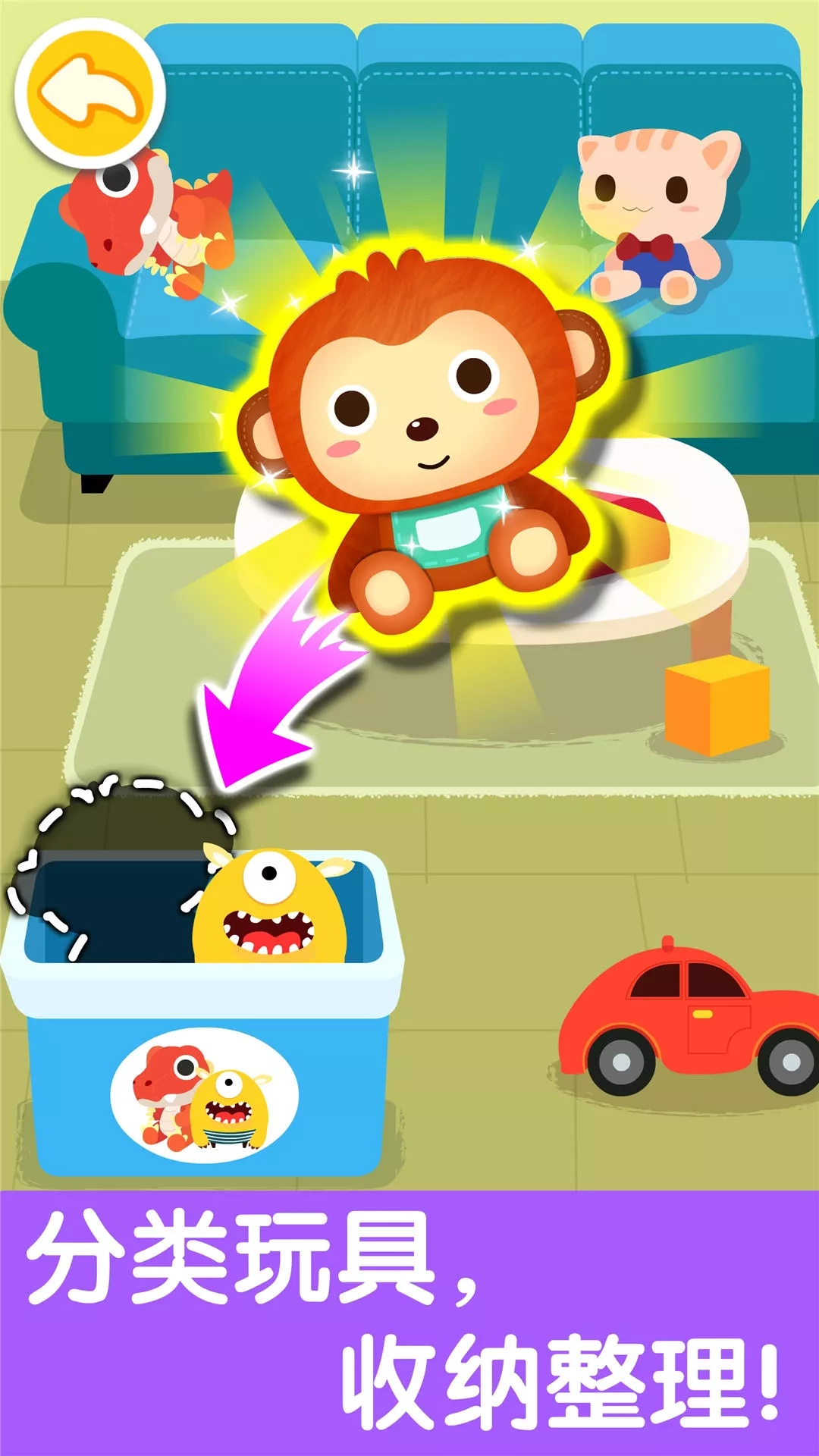【宝宝爱整理】是宝宝巴士一款家务学习类早教益智APP,包含垃圾分类、整理配对鞋子、按颜色归纳物品等益智互动,让幼儿养成良好的生活习惯,成为勤劳的“家务小达人”! 宝宝们,来打扫卫生,整理房间咯~ 【家务小达人上线】 ·打扫庭院 先从庭院开始!推动除草机,修剪草坪,再把树木修剪出“小熊猫”的形状。 小兔子的窝脏兮兮,宝宝赶快用抹布清理干净。接着,把胡萝卜喂给小兔子吧! ·清洁客厅 客厅里到处都是玩具!宝宝捡起积木和玩偶,分类后,把它们放进相应的收纳篮里。 鞋柜也需要宝宝整理哦。认真看一看,把每一双鞋子配对成功后,再放进鞋柜! ·收拾书房 来收拾书房啦。挥舞鸡毛掸子,清理书柜上的灰尘、蜘蛛网,把相同颜色的书本摆放在一起。 地板上的垃圾要正确分类,宝宝知道如何进行垃圾分类吗?快来学习吧。 ·整理卧室 接下来,宝宝把卧室打扫干净。将公主裙和外套整理好,挂进衣柜,衣服不能乱丢哦~ 皇冠发卡坏了。宝宝动动手,涂抹胶水,再粘上亮闪闪的宝石,最后记得放进收纳盒! 家里的浴室、厨房也需要清理呢。宝宝快来动手整理,做爸爸妈妈的小帮手! 宝宝巴士【宝宝爱整理】通过将垃圾分类、配对玩法、颜色分类玩法等乐趣融入早教启蒙中,以早教启蒙形式进行儿童好习惯教育,达到幼儿早教启蒙的良好效果。宝宝巴士玩法大全免费,关注儿童教育宝宝学前教育~ 儿童免费3岁~6岁 宝宝巴士从健康、语言、社会、科学、艺术五大领域关注幼儿成长,根据幼儿不同年龄段左右脑发育、敏感期特点和学习重点来设计产品,打造“年龄+能力”的教育产品体系。让孩子学会独立思考,享受探索世界的乐趣。 【宝宝巴士】是全球3.5亿家庭用户的早教选择! 【宝宝巴士】儿童早教首选app,众多儿童早教家庭的一致选择,得到宝宝巴士儿歌、宝宝巴士玩法大全、麦田、宝宝树亲宝宝、 宝宝巴士奇妙屋、宝宝巴士、宝宝知道app、宝宝巴士世界、宝宝梦想小镇、宝宝超市等使用者的一致推荐。 ----------------------------- 欢迎联系: 微信:宝宝巴士 微博:@宝宝巴士 官网:http://www.babybus.com 邮箱:cn@babybus.com
