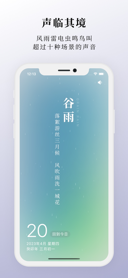 【知时节】探知二十四节气、七十二候与中国传统节日,感受中国传统文化之美。 二十四节气是通过观察太阳周年运动而形成的时间知识体系及其实践,这些节气分别标志着一年中的重要时刻,如农作物的播种、生长、收获,以及人们的生活习惯等。 七十二候是我国古代用来指导农事活动的历法补充,以五日为候,三候为气,六气为时,四时为岁,一年“二十四节气”共七十二候。 功能特点: - 精美的界面,简洁优雅的设计,应时节特点而变化、流动的渐变色彩。 - 展示当前的二十四节气、七十二候、传统节日并配以相关的诗词。 - 提供了知识卡片,了解每个时节背后的含义。 - 每个节气、物候、传统节日都附有超过十多种场景的白噪音,让你身临其境。 - 每个物候都提供了相应的花信。 - 应用支持 Apple Watch,方便您随时查看和使用。 - 提供 Widget 小组件,在锁屏界面和主屏幕上便捷使用。 - 支持冬至数九、入梅/出梅、三伏天