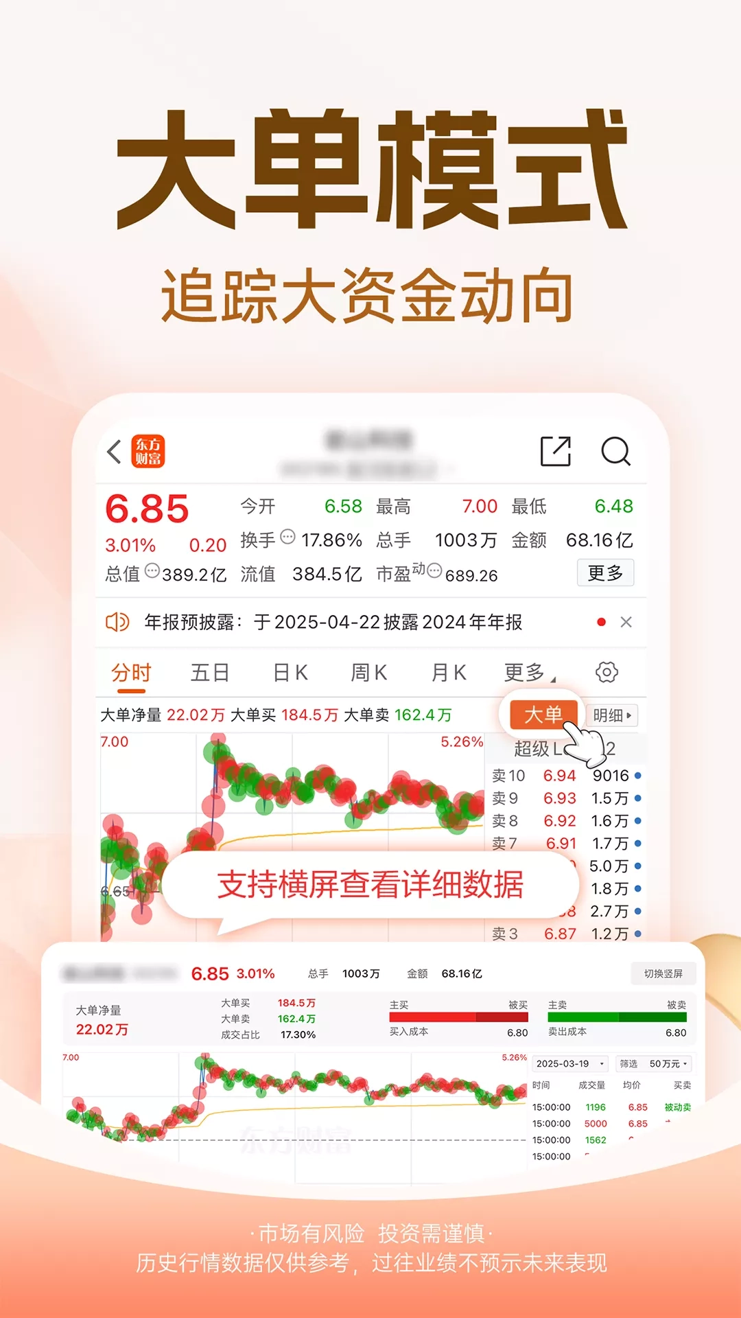 东方财富APP又升级啦!东方财富APP覆盖了股票、基金、期货、债券、外汇、银行、保险等诸多金融领域数据,每日更新数万条财经资讯信息,为用户提供便利服务。 特色功能: ●妙想AI——更懂股民的金融大模型,深度思考、专业数据、更懂金融,更优体验 ●股吧——中国高人气股票主题社区,覆盖财经资讯、股友评论、个股行情、股市热点、基本面数据等多个股市实用功能 ●专业数据——覆盖全球重要市场行情 ,汇集股票新股申购、公司资料、证券投资研报等金融行业数百亿条数据 ●开户交易——全程网上股票开户,不排队,炒股佣金不高于万2.5,更有开户惊喜福利,交易安全、方便、快捷 ●即时提醒——股友互动、市场热点、自选股(公告、研报、数据等)动态消息及时提醒 ●主力资金流——真实还原实时主力大单,揭秘主力资金布局 ●高手跟踪——实盘组合、高手看盘、专业投顾百家争鸣,还有百万奖池的实盘大赛等你参加 ●智能选股——主题投资、画线工具、筹码分布、分时叠加、超级Level-2、盘口异动、资金流向,从选股到分析到盘中决策,智能选股工具为您的投资决策助力 ●丰富活动——好礼天天领,更有丰富模拟活动带你轻松玩转各类投资