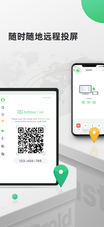 AirDroid Cast是一款功能强大的投屏应用,可以轻松将您的任何移动设备投屏到桌面系统上,无论是Window系统还是Mac系统。即使您的设备和电脑不在同一个地方,哪怕在不同城市,AirDroid Cast也能帮您轻松实现远距离投屏。 您可以将AirDroid Cast用于哪些场景? 在线教学 随身携带的的手机、平板等设备成为教学的第二块便携黑板,老师上课时可以通过AirDroid Cast将设备画面投屏至电脑上,展示课件、习题等多媒体文件。 远程教学时,您还可在投屏的同时,直接在移动设备上书写板书,与学生互动。让课堂更智慧,让学习更有趣。 远程会议 当您在出差或远程办公时,AirDroid Cast可以让您更轻松地进行远程会议,不需要付高昂的软件或其他硬件费用。同事间可以将各自的设备画面分享到会议主持者的电脑上,在线书写作图,并通过双向通话功能在线沟通。 在线演示 主持公司会议、培训课程、产品演示,只需通过AirDroid Cast将设备上的文稿或应用程序界面无线投屏至会议室电脑上,即可展现所有资料内容。 游戏娱乐&直播 通过AirDroid Cast 您可以轻松将手机上的游戏画面投射到电脑上,并通过直播平台分享给粉丝。您还可以使用AirDroid Cast同时投射多个手机画面到电脑,实现多人投屏进行游戏竞技。 功能特性: 简化投屏流程 无需帐号注册和设备绑定,仅需扫描AirDroid Cast电脑客户端的二维码或输入投屏连接码,即可通过wifi将手机屏幕投射到电脑上。 屏幕和声音同时投屏到电脑 您可以在使用AirDroid Cast投屏的同时,将手机麦克风的声音传输到电脑上。当您进行远程会议的时候,您可直接通过AirDroid Cast的双向通话功能和与会者在线沟通,提高远程会议的沟通效率。 不受限网络环境,随时投屏 无论手机和PC是否在同一个网络下,你都可以使用AirDroid Cast将手机屏幕投射到电脑上。您可在局域网内畅享AirDroid Cast的所有服务,若升级为高级会员,还可在远程网络下使用AirDroid Cast进行远程会议等场景使用。 多台设备同时投屏 AirDroid Cast最多支持5台设备同时投屏到电脑。这意味着,您可在电脑上享受到多人游戏体验,当您需要进行会议时,还可以直接在电脑上观看到来自不同参会者的演示文稿。 ---------------------- 隐私政策: https://cast.airdroid.info/#/Privacy 用户条款: https://cast.airdroid.info/#/Eula 支付条款: https://cast.airdroid.info/#/Payment
