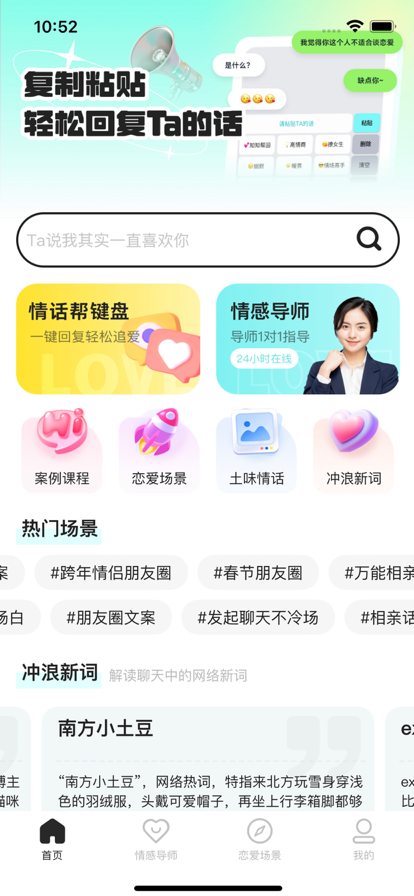 情话帮是一款能够教您如何聊天的工具,输入聊天话题即可获得有趣回复,从此让你不再找不到聊天话题。内置100W+聊天话术,不会聊,搜一搜,N+精彩回复供你选择,让聊天变得更加简单有趣。 【功能介绍】 1.100w+聊天话术,助你轻松脱单; 2.一键复制,精准匹配,快速获得多种巧妙回复; 3.土味情话,帮您快速掌握聊天技巧; 4.众多恋爱表情包,套路也很多; 5.应用中会搜集北京、上海等一些城市的相亲活动,用户可以挑选加入行程中,会时常提醒用户截止日期; 6.放松:应用提供了一些休闲场景、音乐,供用户闲暇时放松; 【情话帮自动续费会员】 --会员权益:享受搜索无限次数特权,同时海量话术内容全部开放、一键下载、分类解锁、身份标识等特殊权益。 --订阅方式:3天免费试用期,试用期结束后,回自动续订 --付款:用户确认购买并付款后记入iTunes账户 --取消订阅:如需取消续订,请在当前订阅到期24小时以前,手动在iTunes/Apple ID设置管理中关闭自动续订功能 --续订:苹果iTunes账户会在到期前24小时内扣款,扣款成功后订阅周期顺延1个月 --隐私政策:http://ios.oss.ykangnet.com/5c6e8857-d967-41b1-91bd-0b2436c7ed57_f_1179052776.html --用户协议:http://ios.oss.ykangnet.com/5c6e8857-d967-41b1-91bd-0b2436c7ed57_f_918350990.html --自动续费会员服务协议:http://ios.oss.ykangnet.com/5c6e8857-d967-41b1-91bd-0b2436c7ed57_f_1319164755.html