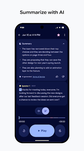 告别团队会议或课堂笔记的桎梏。获取 AI 会议助手,它可以录制音频、做笔记、创建语音备忘录、自动捕捉幻灯片并转录语音摘要。实时显示字幕。非常适合现场录音和在线会议。也提供网页版。仅支持英语、西班牙语和法语。<br><br>将 1 小时的会议压缩为 30 秒。Otter 可实时转录您所有的会议、采访、讲座和日常语音对话。获取适用于现场会议、Zoom、Google Meet 和 Microsoft Teams 的自动笔记。<br><br>主要功能<br>★ AI 聊天:获取答案,撰写电子邮件<br>★ AI 会议笔记和实时 AI 转录<br>★ 录音机<br>★ 实时转录笔记<br>★ 自动会议笔记、语音备忘录和摘要<br>★ AI 频道:可在多个频道上即时聊天<br>★ 分享与协作<br>★ 所有笔记均可搜索和共享<br>★ 编辑和高亮<br>★ 整理和导出<br>★ 导入和同步<br><br>多种用途<br>★ 节省时间 - 自动笔记<br>★ 保持团队同步 - 分享笔记和行动事项<br>★ 录制和转录访谈、讲座、播客、视频、网络研讨会和主题演讲<br>★ 为任何有辅助功能需求的用户提供实时字幕<br><br>实时录制和转录<br>★ 使用小部件和快捷方式,一键即可立即录制<br>★ 在线时实时转录,准确率高<br>★ 自动笔记<br>★ 突出显示要点以供日后查看<br>★ 插入白板讨论、幻灯片等的照片<br>★ 向后滚动以获取报价或再次访问要点<br>★ 通过内置麦克风或蓝牙设备输入音频<br><br>用人工智能丰富笔记<br>★ 人工智能会议笔记<br>★ 自动添加标点符号、首字母大写和分段<br>★ 识别发言者(需经过培训)<br>★ 虚拟团队会议期间自动截取幻灯片<br>★ 所有团队会议结束后自动生成摘要<br><br>共享与协作<br>★ 在群组内开始会议录制,并实时分享会议记录<br>★ 邀请同事协作查看、编辑和突出显示。所有突出显示的内容都记录在“要点”面板中。<br>★ 在“要点”面板中,添加评论并分配待办事项。<br>★ 通过链接分享至外部<br><br>搜索与播放<br>★ 搜索文本,无需逐行浏览整个音频<br>★ 以可调速度播放<br>★ 音频播放时,跟随高亮词播放<br>★ 点击任意词即可将音频跳转到该位置<br><br>编辑与高亮<br>★ 编辑文本以更正任何错误<br>★ 标记发言者以标记段落并训练 Otter 识别会议发言者<br>★ 一键高亮句子<br><br>整理与导出<br>★ 将对话和笔记整理到个人文件夹中<br>★ 复制到剪贴板,或直接分享到其他应用<br>★ 将文本导出为 PDF、TXT 或 SRT 格式<br>★ 将音频导出为 MP3 格式<br><br>导入与同步<br>★ 导入音频(aac、m4a、mp3、wav、wma)和视频(avi、mov、mp4、mpg、wmv)<br>★ 从通话录音器 - ACR 或其他通话录音应用上传<br>★ 与您的日历同步,获取录制团队会议的提醒并自动为会议添加标题笔记<br>★ 导入联系人,更轻松地分享<br>★ 自动将您的数据备份到 Otter 云端,并通过任何设备安全访问<br><br>Otter Pro<br>★ 批量导出<br>★ 更快的播放速度和跳过静音<br><br>系统要求<br>※ Android 6.0 及更高版本<br>※ 转录所需的互联网连接<br>※ 创建帐户。请参阅我们的服务条款:otter.ai/terms-of-service<br><br>我们非常重视安全和隐私。您的数据在 Otter 是保密的。我们不会将您的数据出售或共享给第三方。您可以完全控制永久删除您的数据。了解更多信息,请访问 https://otter.ai/privacy<br><br>联系我们<br>▶ 支持:https://help.otter.ai<br>▶ Facebook:@OtterAI<br>▶ LinkedIn:Otter.ai<br>▶ X(Twitter):@otter_ai<br>▶ 网址:otter.ai