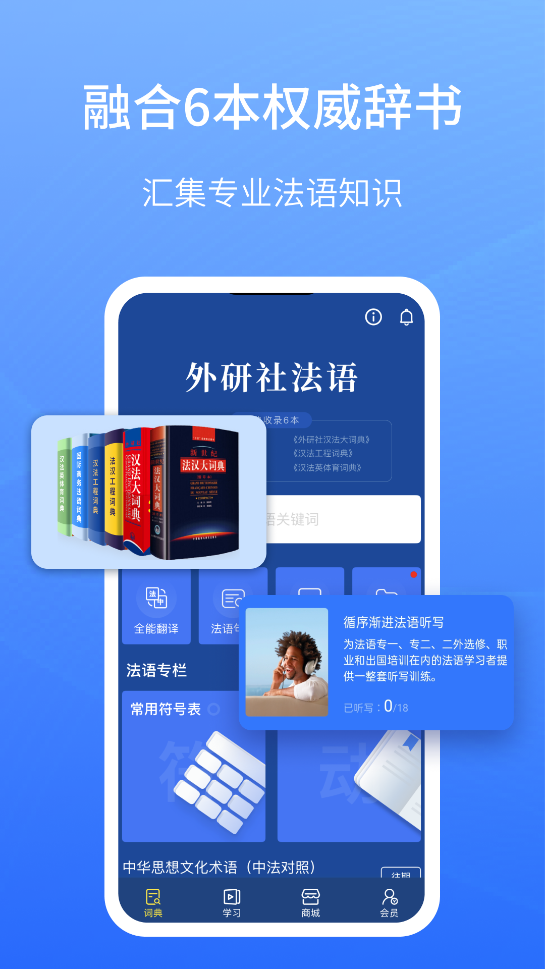 与其他法语学习软件相比,本应用具有五大特色: ①外研社携手海笛出品(著名品牌有品质保障); ②独有的以6部权威词典为基础(《新世纪法汉大词典》、《汉法大词典》等); ③与法语教材/教学相结合(“新经典法语”系列、“你好!法语”系列、“大家的法语”系列); ④内容和功能丰富全面(可查单词、查动词变位、查法语例句,还能背单词、学语法、练听力、练口语等); ⑤从入门到精通(帮初学者入门、帮爱好者拓展、帮从业者进阶) 以权威法语词典为基础—— 《新世纪法汉大词典》、《汉法大词典》、《法汉工程词典》、《汉法工程词典》、《国际商务法语词典》、《汉法英体育词典》等。 聚焦法语学习难题—— 将中国法语学习者的需求细分到词汇、语法、表达、口语等各个方面, 特邀名师录制语法、语音课程,汇总整理法语动词变位表等。 内容特色 【法语教材配套资源】 ①学习栏目内含以下图书配套音频资源:“新经典法语”系列、“你好!法语”系列、法语专四专八考试样题集。 ②创新《大家的法语》系列互动数字教材,配套音视频资源带你轻松入门法语,零基础也可沉浸式畅学。 【收词全面领域广泛】 所收录的词典皆为法语界知名词典专家历时十余载编纂而成,收词覆盖常见词汇、商务词汇、行业词汇,法汉收词12万余条、汉法收词10万余条,涉及多个领域。 【释义简洁例证地道】 词典提供全面详细的词汇义项、例证,力求将每个词条都解析透彻,在答疑解惑的同时,助你有效提升词汇量。 【原汁原味地道发音】 单词、例句提供发音,助你感受原汁原味的法语、学会地道口语。 【畅学法语相关专栏】 动词变位太难记?汇总整理动词变位表、常用动词搭配表、常用符号表,一表在手,想查就查。 法语语法太难学?特邀名师录制语法、语音课程,词汇发音、搭配、句式一网打尽,突破语法难关。 【专注强化听力口语】 --听写训练:分单元进行法语听力训练,提示要点,循序渐进提高法语听力、拼写准确率。 --口语训练:天气、时间、购物、交通……涵盖日常生活社交中的各类常见话题,为学习者提供地道的口语发音指导和录音自查功能,助你克服口语障碍、说好流利法语。 【特色栏目专业度高】 特色栏目《中华思想文化术语》: 教育部、国家语委共同推荐学习,定期更新,用中法双语解读中华文化术语。 【每日一学聚沙成塔】 涵盖每日一词、每日一题(专四/专八模拟题)、每日变位、每日单词与表达五大学习任务,每天智能推荐学习内容,打开软件就能学习新知识。 功能特色 【智能查阅】 支持模糊查询,即使输入不完整单词,也可即时智能匹配。 【多种输入方式】 可以通过键盘输入、语音输入、手写输入、拍照输入等各种方式,实现多场景的快速查词。 【反向查词】 忘记单词怎么办?不知如何用法语表达?只需输入中文意思也可以查到单词。 法汉、汉法双向查词服务,一站式查遍法语词目、短语、例句。 【即点即查】 例句中不认识的单词也能即点即查,不用再退出当前页面查询,减去繁复冗杂的步骤,大大降低了初学者的理解难度。 【背单词】 --个性化定制背诵计划,AI根据艾宾浩斯记忆曲线智能提醒复习,轻松记住单词。 --收录《你好!法语》1-4册课后单词和大学法语四级、法语专四专八单词,专业考试轻松突破。 【学习记录云端存储】 在本地和云端同步存储学习记录,包括学习计划、学习进度、个人收藏等,再也不用担心学习进度丢失。 选择正版应用,学习更有保障!(版权所有,盗版必究)
